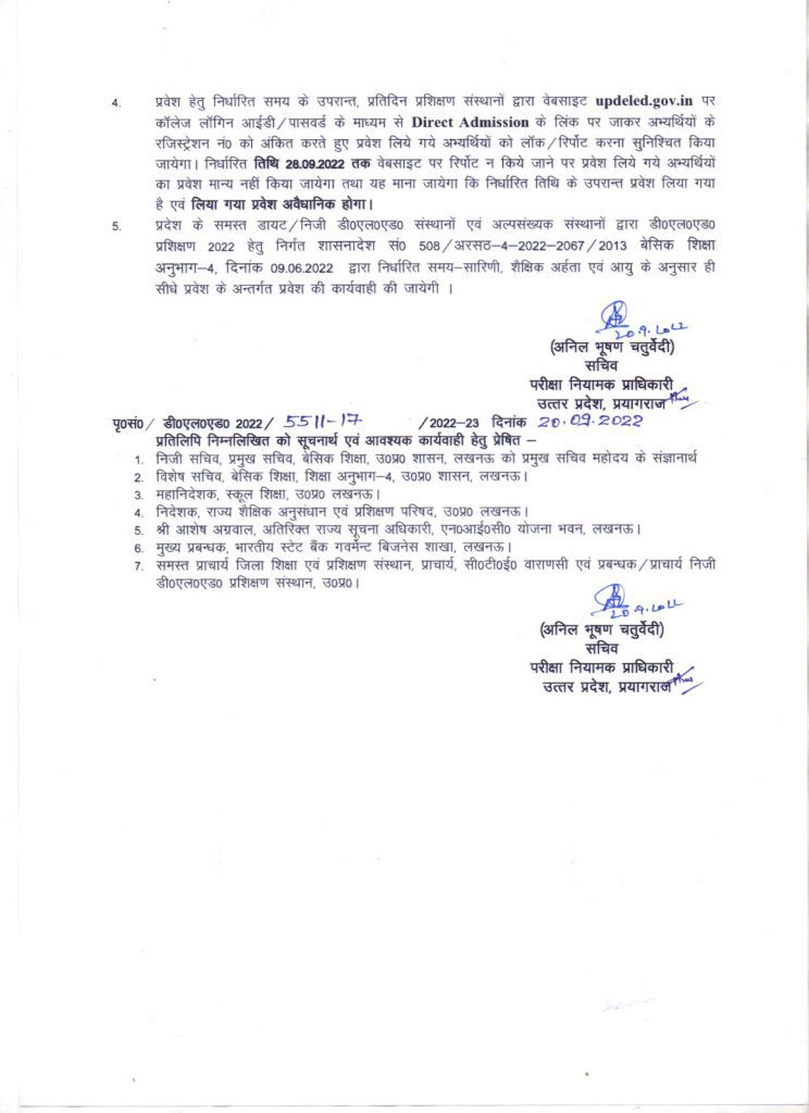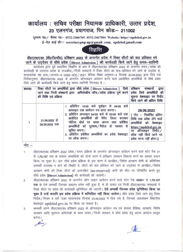 एमडी ब्यूरो/प्रयागराज:यूपी में इस बार डीएलएड में दो चरणों में तकरीबन 41 हजार अभ्यर्थियों के ही प्रवेश हो पाए।जिसके कारण अधिकांश सीट खाली ही रह गए हैं, जिसको देखते हुए डीएलएड (बीटीसी) प्रशिक्षा 2022 के तहत रिक्त सीटों को शतप्रतिशत भरे जाने के लिए शासन ने सीधे प्रवेश की अनुमति दे दी है। दो चरणों की काउंसलिंग के बावजूद 80 फीसदी सीटें खाली रह गईं थीं।
