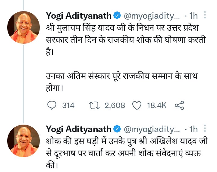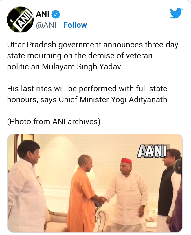 राज्य ब्यूरो/लखनऊ:उत्तर प्रदेश सरकार ने समाजवादी पार्टी के दिग्गज नेता मुलायम सिंह यादव (Mulayam Singh Yadav) के निधन पर तीन दिवसीय राजकीय शोक की घोषणा की है। मुख्यमंत्री योगी आदित्यनाथ ने एक ट्वीट कर कहा कि उनका अंतिम संस्कार पूरे राजकीय सम्मान के साथ किया जाएगा।