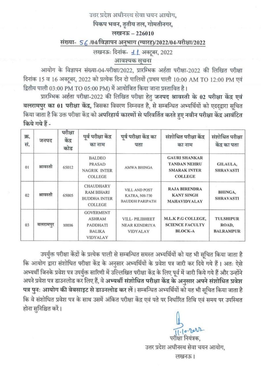 आयोग ने अमवा भिनगा श्रावस्ती में स्थित बलदेव प्रसाद नागरिक इंटर कॉलेज में बनाए गए परीक्षा केंद्र की जगह अब गौरीशंकर टंडन नेहरू स्मारक इंटर कॉलेज को परीक्षा केंद्र बनाया है।