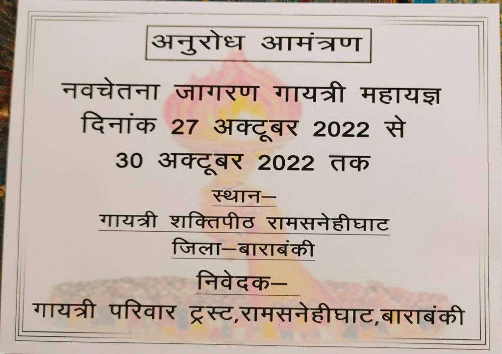 गायत्री परिवार की ओर से नव चेतना जागरण गायत्री महायज्ञ का आयोजन 27 अक्टूबर 2020 से शुरू होकर 30 अक्टूबर 2022 तक चलेगा जोकि गायत्री शक्तिपीठ रामसनेहीघाट बाराबंकी में संपन्न होगा।