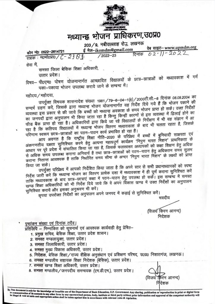 इस संबंध में प्राधिकरण के निदेशक व महानिदेशक स्कूल शिक्षा विजय किरन आनंद ने सभी जिला बेसिक शिक्षा अधिकारियों को पत्र भेजा है। उन्होंने कहा है कि अधिकारियों के निरीक्षण में यह पता चला है कि कुछ विद्यालयों में मध्याह्न भोजन वितरण मध्यावकाश के बाद भी चलता रहता है। इससे छात्र-छात्राओं की पढ़ाई प्रभावित हो रही है।