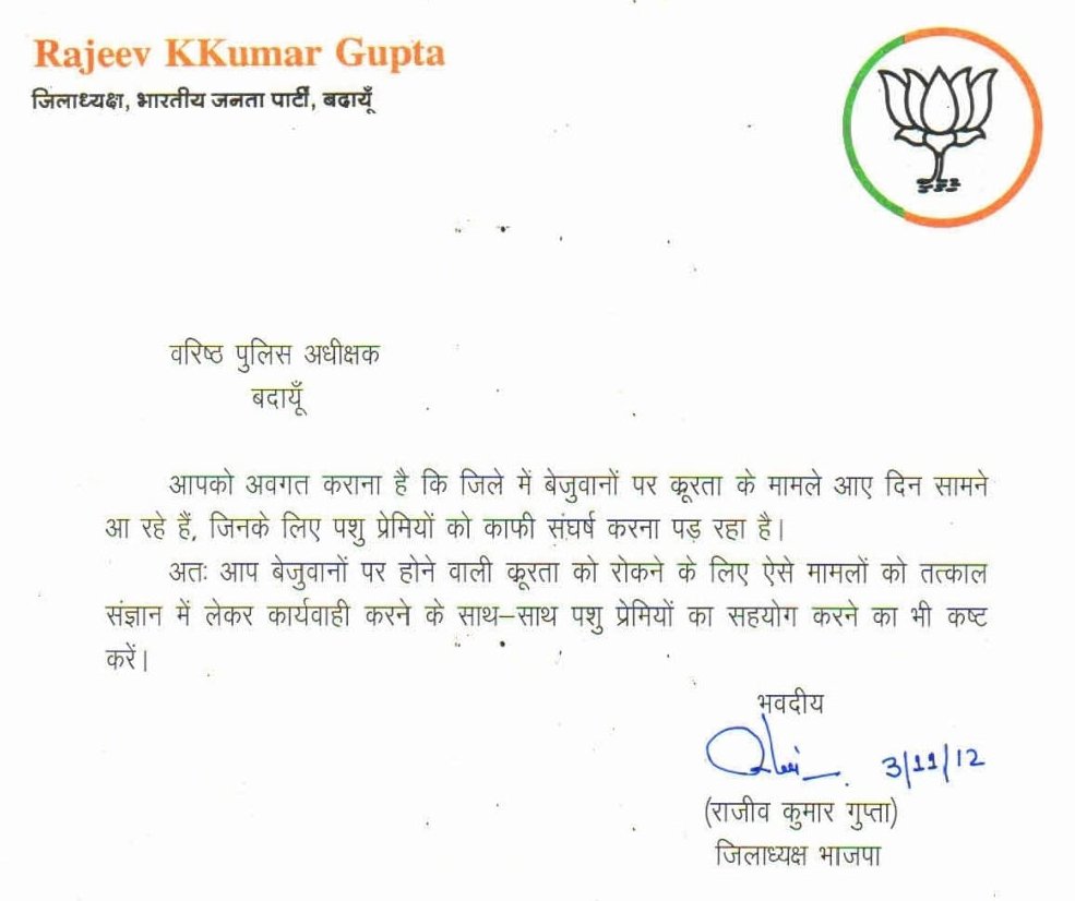 बदायूं में पशुओं के साथ हो रही क्रूरता पर सत्ताधारी भी सक्रिय हो गए हैं। शनिवार को पशु प्रेमी विकेंद्र शर्मा भाजपा जिला अध्यक्ष राजीव गुप्ता से मिले और एसएचओ सिविल लाइन्स द्वारा की गई अभद्रता के बारे में जानकारी दी। वहीं, पशु क्रूरता रोकने के मुद्दे पर भी चर्चा की । इस पर जिलाध्यक्ष ने एसएसपी डॉक्टर ओपी सिंह को पत्र लिखकर पशु क्रूरता के मामलों में आरोपियों के खिलाफ कार्रवाई की पैरवी की साथ ही पशु प्रेमियों का सहयोग करने को कहा । शहर में जहां एक तरफ चूहे की निर्मम हत्या की गई। वहीं इसके बाद सिविल लाइन्स इलाके में पिल्ले को ईंटों से कुचल कर युवक ने मार डाला। इस मामले में पशु प्रेमी ने पुलिस को तहरीर दी थी। इस दौरान एसएचओ सिविल लाइन्स राजेश कुमार और पशु प्रेमी के बीच नोकझोंक भी हुई और नौबत यहां तक आई कि सीएम का नाम भी बहस के बीच सामने आ गया ।हालांकि बाद में पुलिस ने इस घटना का मुकदमा दर्ज कर लिया है ।