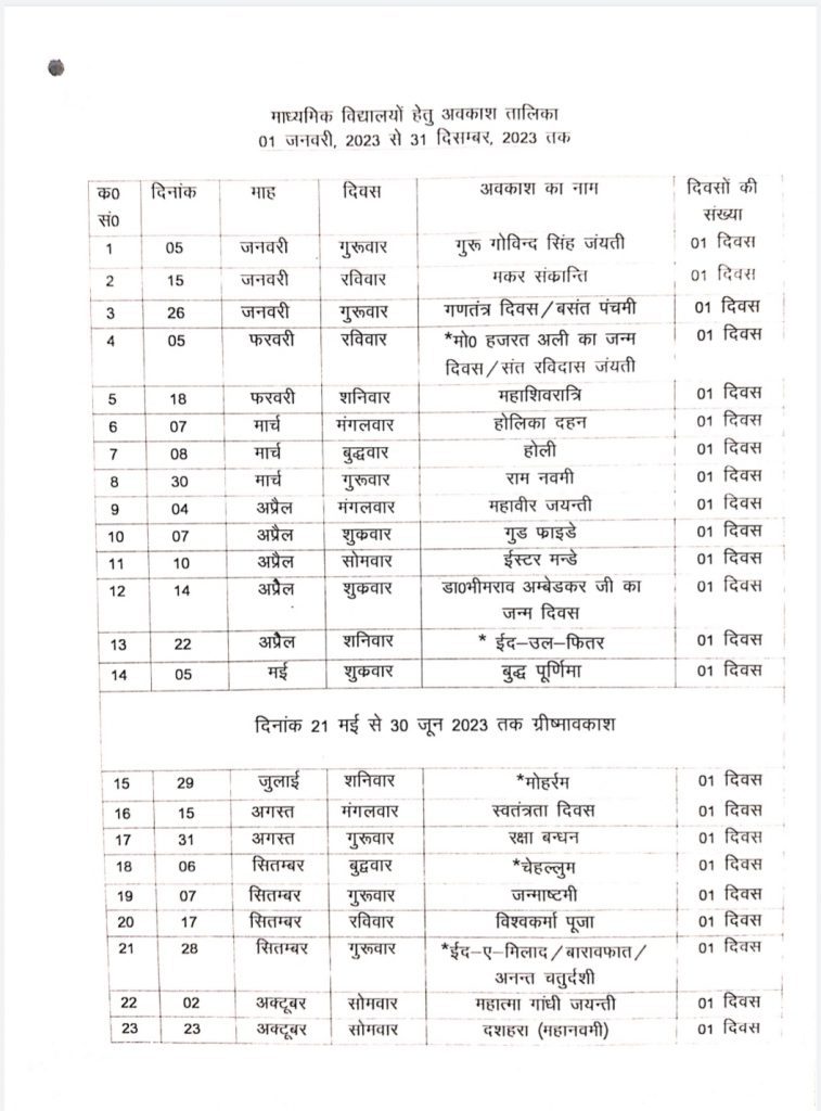 राष्ट्रीय ब्यूरो:प्रदेश के माध्यमिक विद्यालयों में वर्ष 2023 के लिए अवकाश तालिका 2023 किया गया जारी। Post Views: 762 Share this: Click to share on Facebook (Opens in new window) Facebook Click to share on X (Opens in new window) X Click to share on LinkedIn (Opens in new window) LinkedIn Click to share on X (Opens in new window) X Click to share on WhatsApp (Opens in new window) WhatsApp Click to print (Opens in new window) Print Post navigation नगर सहसवान के नवीन संघटक राजकीय महाविद्यालय में प्रवेश हुए प्रारंभ, छात्र छात्राओं को शिक्षा के लिए बाहर जाने की जरूरत नहीं इलेक्ट्रॉनिक बस चलाने की तैयारी