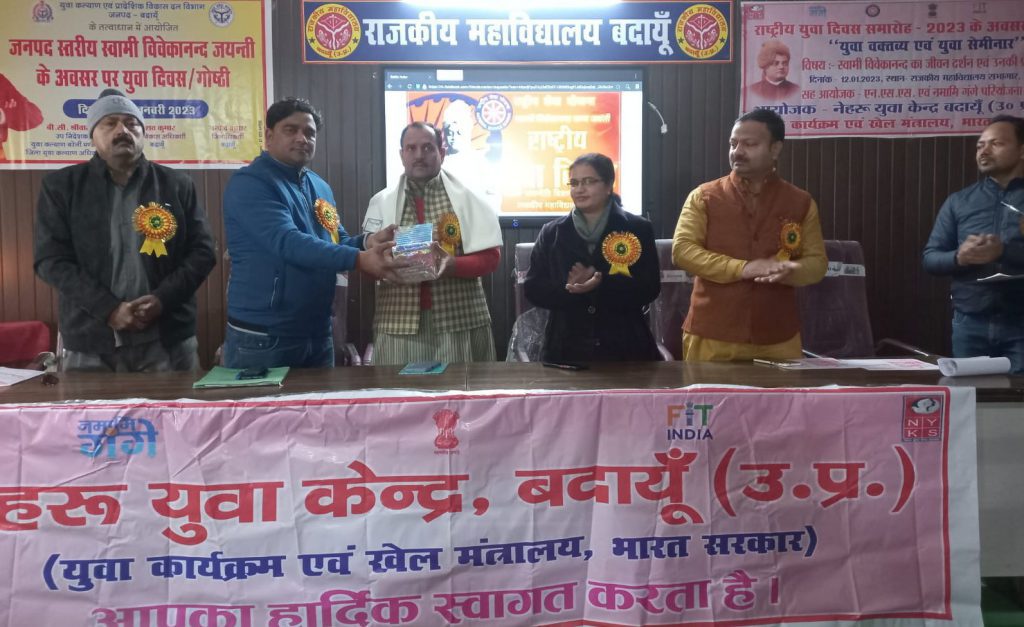 बदायूं/उत्तर प्रदेश : आवास विकास स्थित राजकीय महाविद्यालय बदायूं में राष्ट्रीय सेवा योजना, नेहरू युवा केंद्र, नमामि गंगे परियोजना, युवा कल्याण विभाग एवं स्वावलंबी भारत अभियान के अंतर्गत संचालित जिला रोजगार सृजन केंद्र के संयुक्त तत्वावधान में युवा वक्तव्य सेमिनार का आयोजन कर राष्ट्रीय युवा दिवस के रूप में स्वामी विवेकानंद की जयंती मनाई गई। मुख्य अतिथि जिला सहकारी बैंक के चेयरमैन उमेश राठौर प्राचार्य डॉ श्रद्धा गुप्ता एवं मुख्य वक्ता डॉ राकेश कुमार जायसवाल आदि ने स्वामी विवेकानंद के चित्र पर माल्यार्पण कर एवं दीप प्रज्वलित कर कार्यक्रम का उद्घाटन किया।