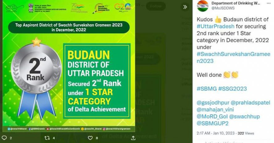 बदायूँ/उत्तर प्रदेश : स्वच्छ भारत मिशन ग्रामीण अंतर्गत स्वच्छ सर्वेक्षण ग्रामीण 2023 का शुभारंभ हो चुका है। इसके अंतर्गत ग्राम पंचायतों द्वारा स्व मूल्यांकन कर अपनी रैंकिंग की जा रही है। इसमें जनपद बदायूं को देश में दूसरा एवं उत्तर प्रदेश में प्रथम स्थान प्राप्त हुआ है। यह स्वच्छ सर्वेक्षण ग्रामीण का प्रथम चरण है, इसके अंतर्गत सबसे अच्छे जनपद एवं ग्राम पंचायत को 02 अक्टूबर 2023 को पुरस्कृत किया जाएगा। जिला पंचायत राज विभाग ने जानकारी दी है कि स्वच्छ सर्वेक्षण ग्रामीण 2023 में ग्राम पंचायतों की दृश्यता स्वच्छता, ठोस अपशिष्ट प्रबंधन एवं तरल अपशिष्ट प्रबंधन की व्यवस्था एवं उन पर किए गए कार्य का निरीक्षण प्रदेश एवं देश स्तर से किया जाएगा और स्वच्छता में जो ग्राम पंचायत और जनपद सबसे अच्छे कार्य करेंगे, उन्हें पुरस्कार दिया जाएगा जनपद बदायूं ने प्रथम चरण में देशभर में दूसरा स्थान प्राप्त किया है ऐसे ही जनपद बदायूं पूरी मेहनत और लगन से कार्य कर रहा है, जिससे जनपद को प्रदेश एवं देश में आगे भी अच्छा स्थान प्राप्त हो सके। जनपद बदायूं को देश में दूसरा स्थान पर मिलने पर पेयजल एवं स्वच्छता मंत्रालय ने अपने ट्विटर हैंडल से बधाई दी है और राज्य स्तर पर पंचायती राज विभाग ने अपने ट्विटर हैंडल से जनपद के कार्यों की प्रशंसा की है। जनपद में स्वच्छ सर्वेक्षण ग्रामीण में दूसरा स्थान दिलाने में जिला पंचायत राज अधिकारी का पूरा योगदान है। उनके प्रयासो से ही जनपद को ये उपलब्धि प्राप्त हुई है।