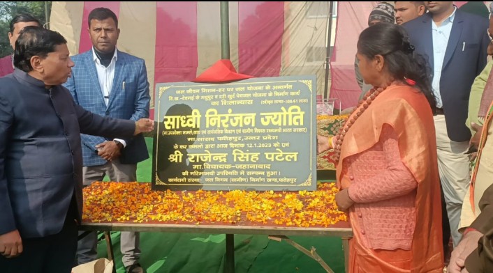 बिंदकी तहसील क्षेत्र के अंतर्गत देवमई ब्लॉक के ग्राम आलमपुर मथुरापुर में पानी टंकी निर्माण के भूमिपूजन कार्यक्रम आयोजित किया गया। कार्यक्रम के मुख्य अतिथि फतेहपुर सांसद केन्द्रीय मंत्री साध्वी निरंजन ज्योति तथा जहानाबाद क्षेत्र के विधायक राजेन्द्र सिंह पटेल द्वारा भुमि पूजन कर शिलान्यास किया गया। इस दौरान सांसद व विधायक ने कहा कि इस योजना से कोई गांव साफ पानी से वंचित नहीं रहेगा। गांवों में पेयजल किल्लत दूर होने के साथ ही प्रति व्यक्ति प्रति दिन के हिसाब से घरों तक पानी उपलब्ध कराया जाएगा। सभी गावों को चरणबद्ध तरीके से कवर किया जाएगा। जिस पर ग्रामीणों ने केंद्रीय मंत्री सांसद साध्वी निरंजन ज्योति व विधायक राजेन्द्र सिंह पटेल का आभार जताया।