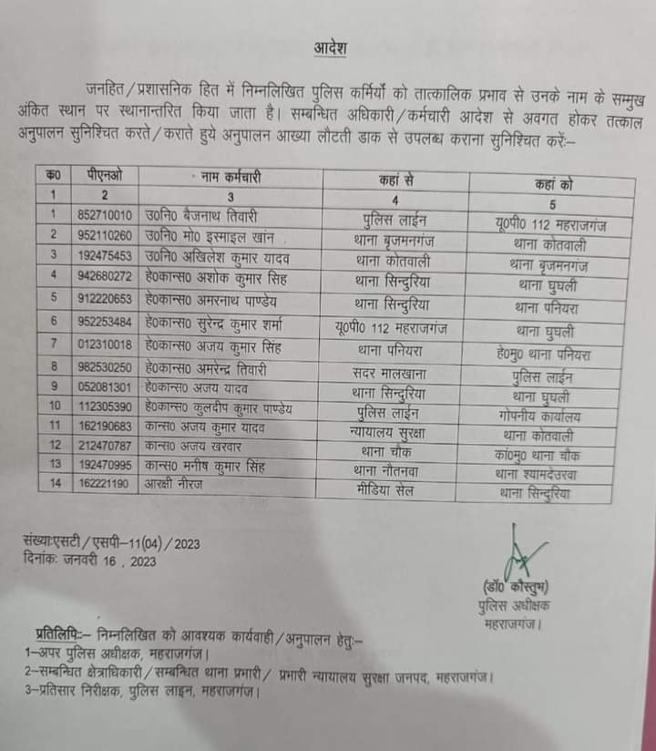 महराजगंज:जनपद में तीन उप निरीक्षक समेत 14 पुलिसकर्मियों के कार्यक्षेत्र में बदलाव। Share this: Click to share on Facebook (Opens in new window) Facebook Click to share on X (Opens in new window) X Click to share on LinkedIn (Opens in new window) LinkedIn Click to share on X (Opens in new window) X Click to share on WhatsApp (Opens in new window) WhatsApp Click to print (Opens in new window) Print Post navigation यूपी:स्कूलों में बंटेगा मोटे अनाजों से बना मिड डे मील, पाठ्यक्रम में भी शामिल होगा मोटे अनाजों की जानकारी.. करंट की चपेट में आने से दुधारू पशु की हुई मौत