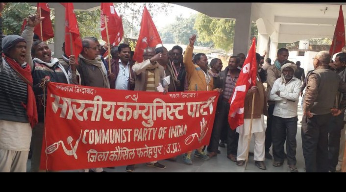 *फतेहपुर जनपद में भारतीय कम्युनिस्ट पार्टी फतेहपुर ने अपने राज्यव्यापी आंदोलन के तहत महामहिम राष्ट्रपति नई दिल्ली के सम्बोधन में उपजिलाधिकारी मनीष कुमार को आरक्षण बचाओ, रोजगार बचाओ, महंगाई हटाओ व भाजपा सरकार हटाओ आदि को लेकर एक मांग पत्र सौंपा। जिसमे राज्य मंत्रिपरिषद के सदस्य मोतीलाल एडवोकेट व कामरेड रहिमाल की अध्यक्षता में धरना प्रदर्शन किया गया। सभा को संबोधित करते हुए राज्य मंत्रिपरिषद के सदस्य मोतीलाल एडवोकेट ने कहा कि भारतीय जनता पार्टी की सरकार राष्ट्रीय स्वयंसेवक संघ के निर्देशन में चल रही है ।जो नफरत की राजनीति कर रही है। यह सरकार दलितों पिछड़ों को मिलाकर आरक्षण को समाप्त करना चाहती है। महंगाई चरम सीमा पर बढ़ गई है। जहां 45% से अधिक जनता गरीबी रेखा के नीचे पहुंच गई है ।देश के 1% लोगों के पास देश की 40 फ़ीसदी दौलत इकट्ठा हो गई है। वर्तमान समय बेरोजगारी का आलम यह है कि घर-घर में पढ़े लिखे नौजवान बेरोजगार बैठे हैं।वही जिला सचिव फूलचंद पाल ने कहा कि केंद्र वह राज्य सरकार जनता की समस्याओं को भटकाने के लिए हिंदू-मुस्लिम का राग अलापने लगती है। वही सभा में अन्य लोगों के अलावा पार्टी राज्य परिषद के सदस्य रामचंद्र,रहिमाल, सहायक मंत्री रामप्रकाश ने भी अपने अपने विचार रखे। प्रदर्शन में प्रमुख रूप से मांग की गई कि आरक्षण बचाया जाए, संविधान बचाया जाए, रोजगार मुहैया कराई जाए, किसानों को समय से खाद बीज तथा उनकी फसलों का वाजिब दाम दिया जाए। फसलों को अन्ना जानवरों से बचाया जाए आदि मुद्दों को लेकर धरना प्रदर्शन कर महामहिम राष्ट्रपति के संबोधन में एसडीएम को मांग पत्र सौंपा गया। इस मौके पर राम अवतार सिंह ,पूरनलाल, नोखेलाल, सुमेर सिंह ,झल्ला सिंह ,जगदेव भाई, जगन्नाथ, कुलश्रेष्ठ ,सूरज, छोटेलाल ,मोती लाल चौधरी, राम शिरोमणि ,महीपत लाल ,जंग बहादुर सिंह ,शिव नारायण साहू, मनोज कुमार ,राम रूप, शिवचरण ,रामशंकर, प्रमोद सिंह एडवोकेट, भैरव प्रसाद, कयूम उद्दीन सहित अन्य लोग मौजूद रहे।