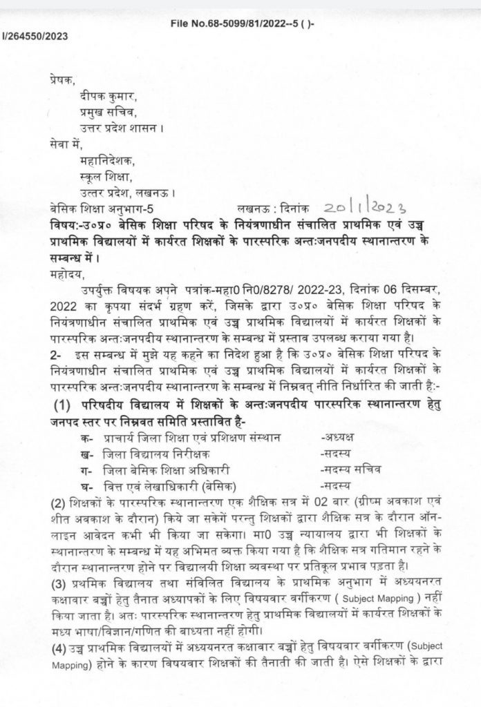 बेसिक शिक्षा परिषद के नियंत्रणाधीन प्राथमिक एवं उच्च प्राथमिक विद्यालयों में कार्यरत शिक्षकों के अंतर्जनपदीय स्थानांतरण का आदेश जारी,देखें..