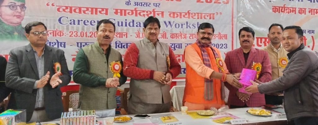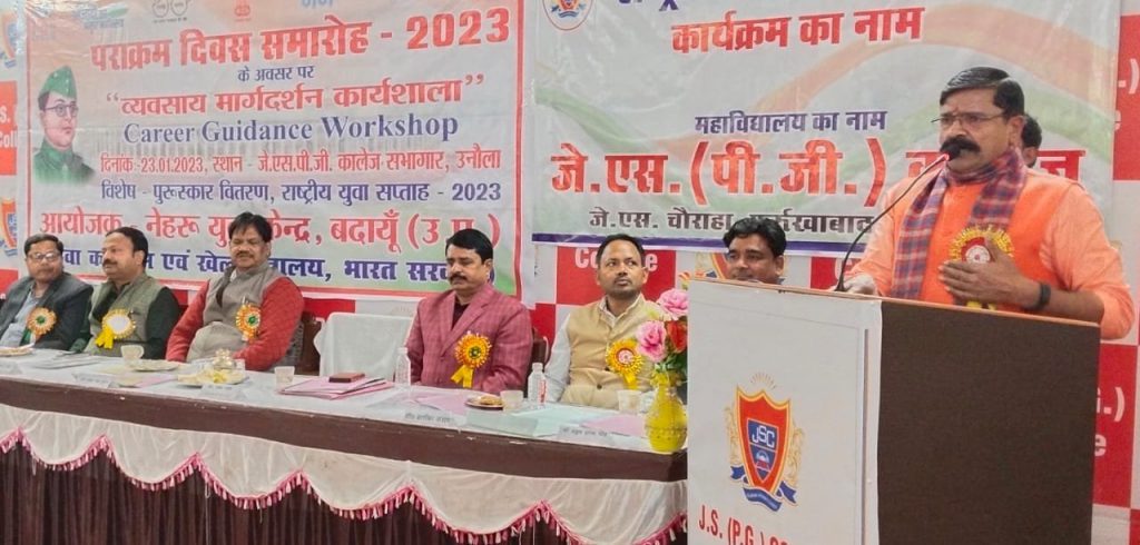 बदायूं/उत्तर प्रदेश : युवा कार्यक्रम एवं खेल मंत्रालय भारत सरकार के नेहरू युवा केंद्र बदायूं द्वारा नेता जी सुभाष चन्द्र बोस जयंती पराक्रम दिवस के अवसर पर कैरियर गाइडेंस वर्कशॉप का आयोजन जेएस पीजी कॉलेज उनौला के सभागार में किया गया, जिसमें इन्दिरा गांधी राष्ट्रीय मुक्त विश्वविद्यालय के द्वारा विभिन्न प्रकार के डिग्री डिप्लोमा के विषय में छात्र छात्राओं का मार्गदर्शन कर कैरियर बनाने के लिए प्रेरित किया गया। कार्यक्रम का शुभारंभ नगर विधायक महेश चंद्र गुप्ता, जिला युवा अधिकारी डॉ दिनेश यादव, एनएसएस के जिला नोडल अधिकारी डॉ राकेश कुमार जायसवाल एवम प्रबंधक नरेंद्र यादव ने मां सरस्वती स्वामी विवेकानंद और सुभाष चंद्र बोस के चित्र पर माल्यार्पण कर और दीप प्रज्ज्वलित कर किया l इस अवसर पर युवा सप्ताह की विभिन्न प्रतियोगिताओं के 75 विजेता युवाओं को सम्मानित किया।
