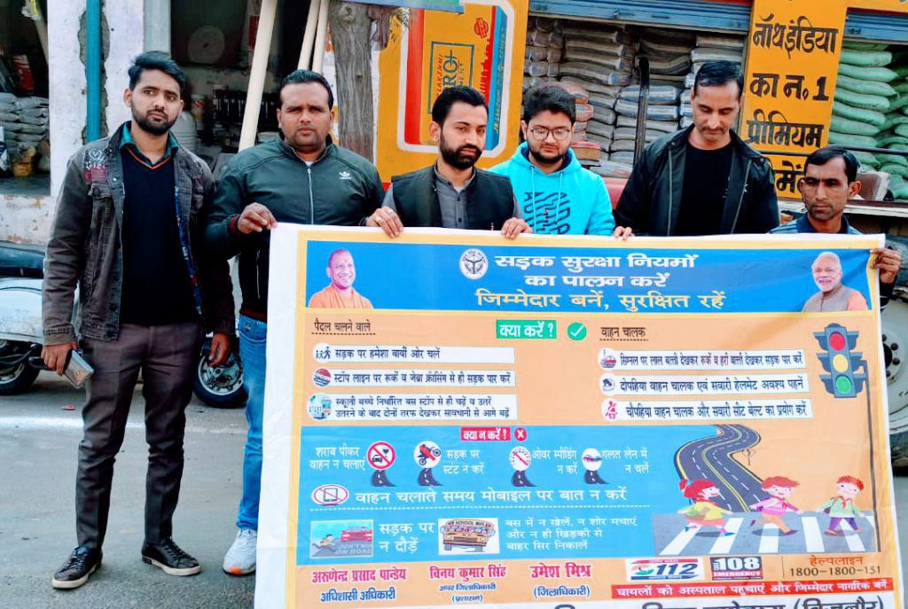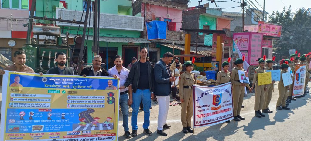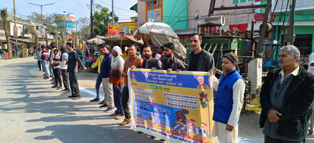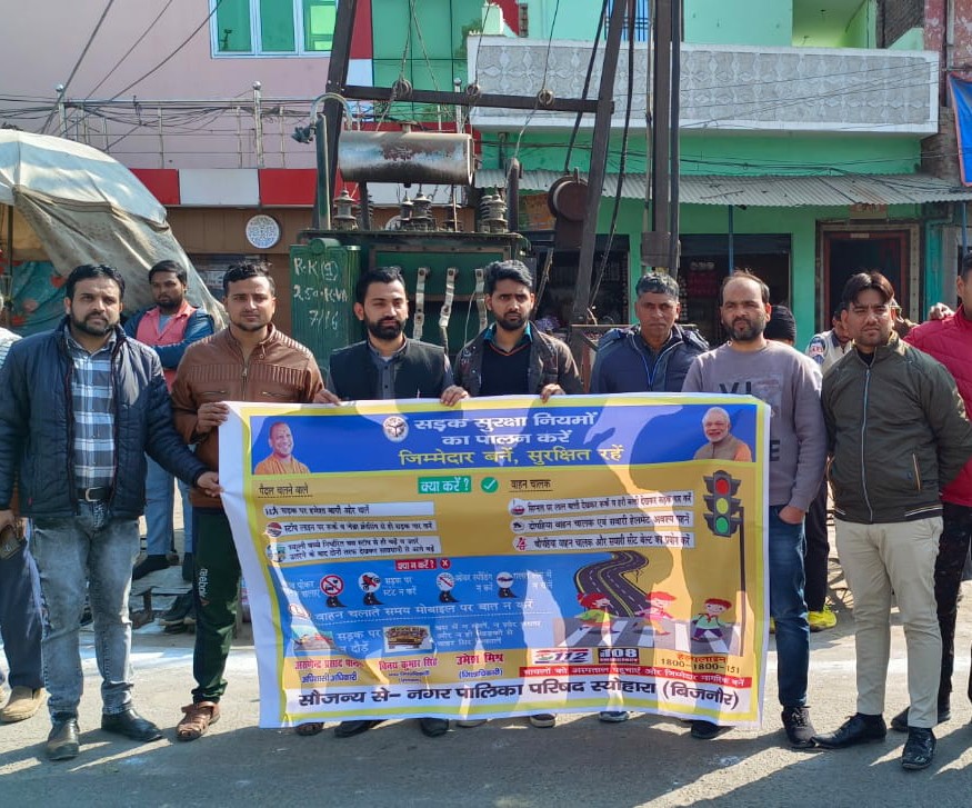 स्योहारा – दिनांक 23 जनवरी 2023 को शासन तथा जिलाधिकारी महोदय बिजनौर के निर्देशानुसार अधिशासी अधिकारी ए पी पांडे के नेतृत्व में स्वतंत्रता सेनानी नेताजी सुभाष चंद्र बोस जी की जयंती के अवसर पर नगर पालिका परिषद स्योहारा प्रांगण में सड़क सुरक्षा शपथ दिलाई गई इसके पश्चात नगरपालिका कर्मचारी गणों तथा आरएसपी इंटर कॉलेज एवं एम क्यू इंटर कॉलेज के एनसीसी व स्काउट गाइड के छात्र एवं छात्राओं द्वारा कार्यालय नगर पालिका परिषद स्योहारा से थाना चौराहा तक एक विशाल मानव श्रृंखला का आयोजन किया गया जिसमें स्वयं सहायता समूह द्वारा भी सहयोग प्रदान किया गया और छात्र-छात्राओं एवं नागरिकों द्वारा प्रतिभाग कर यातायात के प्रति जागरूक किया इस जागरूकता अभियान में मानव अधिकार संगठन से एवं पश्चिम उत्तर प्रदेश उद्योग व्यापार मंडल से अध्यक्ष आसिफ रईस ,महामंत्री मोहम्मद शावेज ,कोषाध्यक्ष फैजान खान ,कानूनी सलाहकार एडवोकेट उदित राज वर्मा , मीडिया प्रभारी नसीम अहमद ,नगर मंत्री कुर्बान अली ,सुभान अली आदि सदस्यों का योगदान नगर पालिका कर्मचारियों में सागर अवर अभियंता ,देवेन्द्र सिंह बाबू ,मोहम्मद शान लिपिक ,ओमप्रकाश पम्प चालक, चांदनी परवीन बाबू ,शमीमा खातून ,आयुष , जुवेशी ,पंकज , रामगोपाल आदि का योगदान रहा।