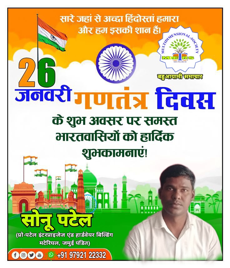 आप सभी ग्रामवासियों, क्षेत्रवासियों एवं समस्त देशवासियों को पटेल इंटरप्राइजेज जमुई पंडित के प्रो-सोनू पटेल के तरफ से हार्दिक शुभकामनाएं एवं बधाई।
