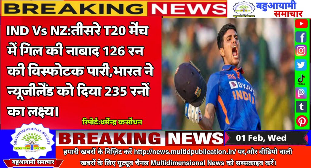 अहमदाबाद: भारतीय टीम के सलामी बल्लेबाज शुभमन गिल (Shubman Gill) न्यूजीलैंड (IND vs NZ) के खिलाफ टी20 सीरीज के पहले दो मैचों में फ्लॉप रहे थे। लेकिन सीरीज के तीसरे मुकाबले में गिल ने शतक ठोक दिया है। और अंत तक नाबाद 126 रन की पारी खेल टीम को उच्च स्कोर तक पहुंचाया। पिछले महीने ही श्रीलंका के खिलाफ गिल ने अपना पहला टी20 इंटरनेशनल मैच खेला था। इस मैच से पहले उनके बल्ले से फिफ्टी भी नहीं निकली थी।