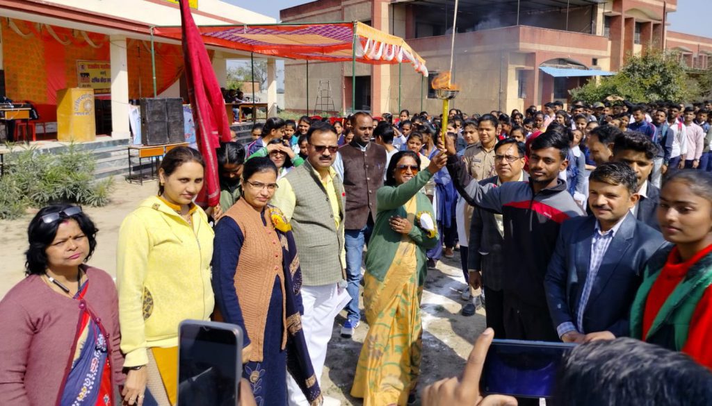 बदायूं/उत्तर प्रदेश : आवास विकास स्थित राजकीय महाविद्यालय में चल रहे युवा महोत्सव के अन्तर्गत 18 वां वार्षिक क्रीड़ा समारोह का उद्घाटन ध्वजारोहण,पिछले सत्र के चैम्पियन को मशाल देकर एवम मार्चपास्ट की सलामी ले कर मुख्य अतिथि राजकीय महिला महाविद्यालय की प्राचार्या डॉ स्मिता जैन ने किया। छात्रा चैंपियन प्रगति शाक्य के नेतृत्व में खिलाड़ियों ने मार्च पास्ट किया तथा छात्र चैम्पियन रामलखन प्रताप ने मशाल लेकर ट्रैक पर दौड़ लगाई। क्रीड़ा प्रभारी डॉ हुकूम सिंह ने खेल की मर्यादा व अनुशासन की शपथ दिलाई। मुख्य अतिथि ने कहा कि युवाओं को खेल की भावना से खेल खेलते हुए इसे अपने जीवनचर्या का अनिवार्य अंग बनाना चाहिए। मुख्य अतिथि का स्वागत, बैज, माल्यार्पण आदि के द्वारा किया गया। प्राचार्य डॉ श्रद्धा गुप्ता ने स्मृति चिन्ह प्रदान किया।