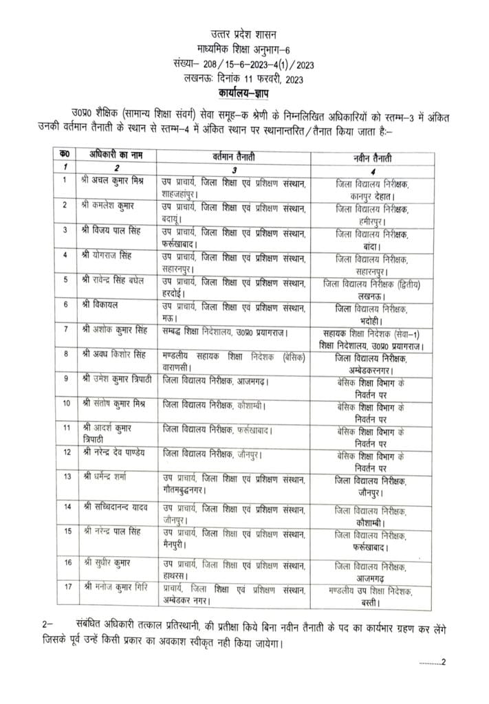 इसी प्रकार सहारनपुर स्थित जिला शिक्षा एवं प्रशिक्षण संस्थान के उप प्रचार्य योगराज सिंह को सहारनपुर का ही जिला व्द्यिालय निरीक्षक (डीआईओएस) तथा हरदोई के जिला शिक्षा एवं प्रशिक्षण संस्थान के उप प्राचार्य रावेन्द्र सिंह बघेल को डीआईओएस द्वितीय बनाया गया है। मऊ के जिला शिक्षा एवं प्रशिक्षण संस्थान के उप प्राचार्य विकायल को भदोही का डीआईओएस तथा शिक्षा निदेशालय, प्रयागराज से सम्बद्ध अशोक कुमार सिंह को निदेशालय में ही सहायक शिक्षा निदेशक (सेवा-1) के पद पर तैनाती दी गई है।