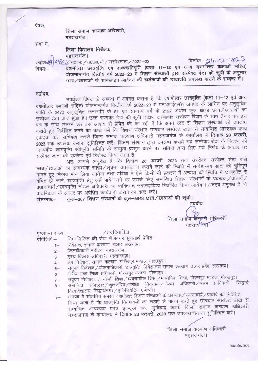 महराजगंज:उत्तर प्रदेश में अध्धयन कर रहे संस्थागत छात्र छात्राओं को छात्रवृत्ति एवं शुल्क प्रतिपूर्ति योजना का लाभ समय से मिल सके इसके लिए सरकार ने छात्र छात्राओं की आवेदन में आये त्रुटियों को सभी जिला समाज कल्याण विभाग के अधिकारियों को ज़िले के उच्च शिक्षण संस्थानों के संदेहास्पद डाटा को अतिशीघ्र वेरिफिकेशन करके फॉरवर्ड कराने की जिम्मेदारी सौंपी है।ऐसे में महराजगंज जिले के कुल 207 शिक्षण संस्थानों में अध्ययनरत SC ,OBC, और GEN के 5648 छात्र छात्राओं के संदेहास्पद डाटा जारी कर दिया है। वही जिला विद्यालय निरीक्षक को प्रेषित कर सभी संस्थाओं से 28 फरवरी तक सभी छात्र छात्राओं की संदेहास्पद डाटा सम्बन्धी आवश्यक दस्तावेज विभाग में जमा कराने की बात कही है।ऐसे में संदेहास्पद डाटा में शामिल सभी वर्गों के छात्र छात्राएं अपने संस्थान पर पहुँचकर अपने आवेदन त्रुटियों से सम्बन्धित दस्तावेज को जमा कर दें।इसके पश्चात छात्र छात्राओं के आवेदन की त्रुटियों को अंतिम रूप मानकर छात्रवृत्ति वितरित कर दी जाएगी।