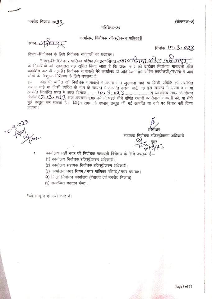 निकायों की वार्डवार वोटर लिस्ट का हुआ प्रकाशन, आमजन के निशुल्क निरीक्षण के लिए उपलब्ध : एडीएम खीरी 10 मार्च। जनपद खीरी की समस्त नगर निकायों के निवासियों को सूचित करते हुए उप जिला निर्वाचन अधिकारी/एडीएम संजय कुमार सिंह ने बताया कि समस्त निकायों की वार्डवार निर्वाचक नामावलियां का प्रकाशन संबंधित नगर निकाय के सहायक निर्वाचक रजिस्ट्रीकरण अधिकारी कार्यालय, सभी नगर पालिका परिषद/नगर पंचायत कार्यालय, संबंधित नगर निकाय के मतदान केन्द्रों, निर्वाचक रजिस्ट्रीकरण अधिकारी कार्यालय तथा जिला निर्वाचन कार्यालय (पंचायत एवं नगरीय निकाय ) पर 10 मार्च को प्रकाशित कर दी गई है। निर्वाचक नामावलियां उक्त वर्णित स्थानों में आम लोगों के लिए निःशुल्क निरीक्षण हेतु उपलब्ध है। वोटर लिस्ट में नाम शामिल, संशोधित, आपत्ति का 17 मार्च तक का मौका*एडीएम ने बताया कि कोई भी व्यक्ति जो निर्वाचक नामावली में अपना नाम जुड़वाना चाहे या किसी प्रविष्टि को संशोधित कराना चाहे या किसी व्यक्ति के नाम के सम्बन्ध में आपत्ति करना चाहे वह इस सम्बन्ध में अपना दावा या आपत्ति निर्धारित प्रपत्र में दिनांक 11 मार्च से कार्यालय समय के दौरान दिनांक 17 मार्च तक अपरान्ह 03 बजे के पहले उक्त वर्णित स्थानों पर तैनात कार्मिक को, या सीधेमुझे प्रस्तुत कर सकता है। विहित समय के पश्चात् प्रस्तुत की गई आपत्ति या दावे पर विचार नहींकिया जाएगा।एडीएम ने बताया कि मतदाता अपना नाम सम्मिलित किये जाने के लिए 11 मार्च से 17 मार्च, 2023 तक की अवधि में राज्य निर्वाचन आयोग, उ०प्र० की वेबसाइट http://sec.up.nic.in पर भीऑनलाइन आवेदन कर सकते हैं। रजिस्टर किये गये मतदाताओं का नाम सम्बन्धित निर्वाचक रजिस्ट्रीकरण अधिकारी ( उप जिला मजिस्ट्रेट) द्वारा जॉचोपरान्त सही पाये जाने पर हीमतदाता सूची में दर्ज किया जायेगा।*यह है आपत्ति का विवरण एवं संबंधित प्रारूप…..*मतदाता सूची में नाम सम्मिलित किये जाने हेतु : (परिवर्धन) नाम सम्मिलित किए जाने के लिए दावा/आवेदन पत्र ( परिशिष्ट – 15 )मतदाता सूची में किसी प्रविष्टि के सम्बन्ध मेंआपत्ति का दावा : (संशोधन) किसी प्रविष्टि में दिये गए ब्यौरे पर आपत्ति (परिशिष्ट- 16 )अन्य विभिन्न कारणों के आधार पर निर्वाचकनामावली से नाम हटाये जाने सम्बन्धी आपत्ति : (विलोपन) नाम सम्मिलित किए जाने पर आपत्ति