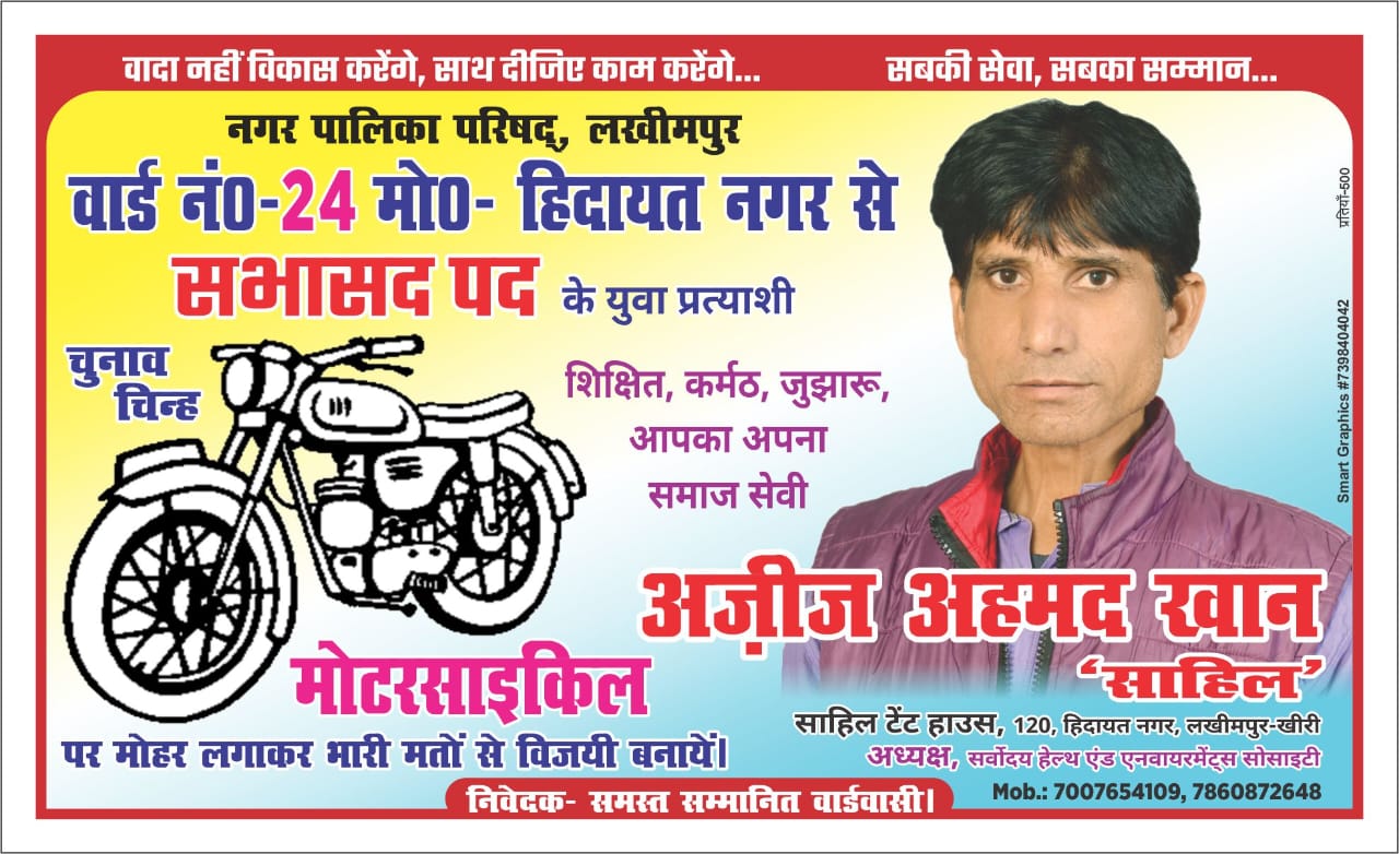 बहुआयामी समाचार जनपद ब्यूरो प्रमुख सर्वेक्षण से उत्तर प्रदेश कि सर्वोदया हेल्थ एंड इंवॉल्वमेंट सोसाइटी के राष्ट्रीय अध्यक्ष जो कि समाजसेवी के तौर पर जाने जाते हैं जिनके द्वारा पिछले लंबे दशकों से मोहल्ला है हिदायत नगर में अनेक प्रकार के सराहनीय कार्य किए गए हैं उदाहरण के तौर पर अनेक जानवरों को (गौ माता) को पालतू कुत्तों को रखरखाव हेतु चिकित्सालय तक पहुंचाने का काम हो, या अनाथ बच्चों को चाइल्ड हेल्पलाइन के माध्यम से सुविधा मुहैया कराना हो, या कारोना कोविद 19 के दौरान आपातकाल की स्थिति में गरीबों के आर्थिक मदद करानी हो, विज्ञान विषय हेतु शैक्षिक होने के नाते सरकार की विभिन्न प्रकार की वार्ड नगरपालिका से संबंधित स्कीम को आम जनता तक पहुंचाने का काम हो, य विभिन्न प्रकार के शासनिक प्रशासनिक दबाव के कारण गरीबों को परेशानी में उनके साथ खड़े होने का काम हो, या मोहल्ले में विभिन्न प्रकार के हैवी मेटल लेड आर्सेनिक का डिटेक्शन (दूषित जल) कराने का काम हो, स्वच्छ जल की सुविधा उपलब्ध कराने का काम हो रोडो पर लाइट के निर्माण का रख रखाव कराने का काम हो आदि,आदि ऐसे अनेक सामाजिक कार्यों की सूची जारी की जा सकती है , ऐसे में प्रश्न बनता है कि चुनाव आते-आते अनेक प्रकार के धनवान बाहुबली लोग ऊर्जा पैसों के बलबूते दावेदारी पेश करते हैं अब वोटरों के पास समस्या अपने प्रत्याशी चुनने की होती है ऐसे में बहुआयामी संस्था उच्च शैक्षिक समुदाय के द्वारा गहन अध्ययन करने पर हिदायत नगर वोटरों से निवेदन किया जाता है कि ऐसे प्रत्याशी जो वैज्ञानिक दृष्टिकोण रखते हैं जिनकी शाहनिक प्रशासनिक पर पैनी नजर रहती है सरकार की सभी विभिन्न स्कीमों को आम जनता तक पहुंचाने का कार्य हो यह स्वस्थ से संबंधित स्वच्छता से संबंधित आदि अनेक प्रकार के कार्यों में लगे रहने वाले साथी ही मोहल्ले की वार्ड की तरक्की के योग्य होते हैं। जिनके सामाजिक कार्य को विभिन्न प्रकार की पत्र-पत्रिकाओं व समाचार पत्रों में समय-समय पर देखने को मिलता रहता है ऐसे में उच्च शैक्षिक राजनीतिक दृष्टिकोण को मद्देनजर रखते हुए आपके वार्ड से प्रत्याशी अजीज अहमद खान ( साहिल चना भाजी इरशाद अहमद खान) हर सहायक गुड में निपुण दिखाई देते हैं इसलिए धनवान बाहुबली को ध्यान में रखते हुए, जो कि आपके वोटों मतों का गलत तरीके से इस्तेमाल करते चले आए हैं और आवश्यकता पड़ने पर पीठ दिखाने का काम करते हैं और वोटरों को ही दोषी ठहराने का काम किया जा रहा है ऐसे प्रत्याशियों से सतर्क व सावधान रहें और बचे, ऐसे प्रत्याशी का चुनाव किया जाना चाहिए जो आपके लिए तन मन धन से खड़ा रहे जिसमें अजीज अहमद खान वार्ड नंबर 24 प्रत्याशी हिदाय नगर(साहिल टेंट हाउस) निपुण साबित होते हैं अतः हिदायत नगर के वोट