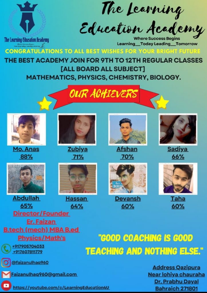द लर्निंग एजुकेशन एकेडमी के छात्र सीबीएसई बोर्ड से कक्षा 10 में प्रथम स्थान प्राप्त किया मोहम्मद अनस ने 88% प्राप्त किया उसने अपने शिक्षक फैजानुल हक के मार्गदर्शक से प्राप्त किया है और उनको धन्यवाद दिया जनपद का नाम रोशन किया जनपद बहराइच में द लर्निंग एजुकेशन एकेडमी पिछले 5 वर्षों से सेवा में तत्पर है और कई बच्चे उच्च स्थान प्राप्त किया है एवं नीट और जेई में भी स्थान प्राप्त किया है और अपने उज्जवल भविष्य को साकार किया है