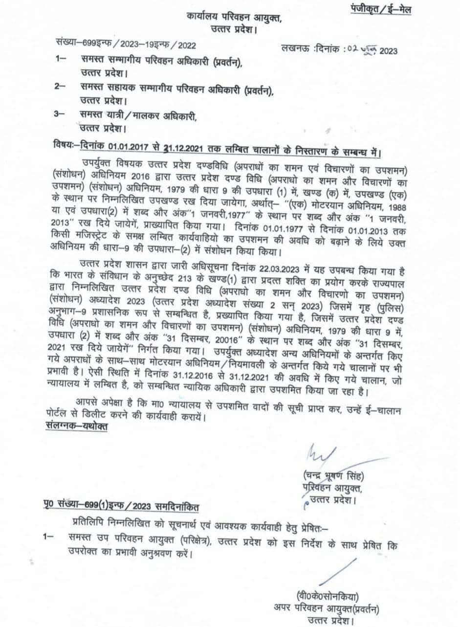 परिवहन आयुक्त चंद्र भूषण सिंह ने सभी संभागीय परिवहन अधिकारियों को दिए निर्देश में कहा है कि न्यायालय में उपशमित वादों की सूची प्राप्त कर ई-चालान पोर्टल से हटा दिया जाए।