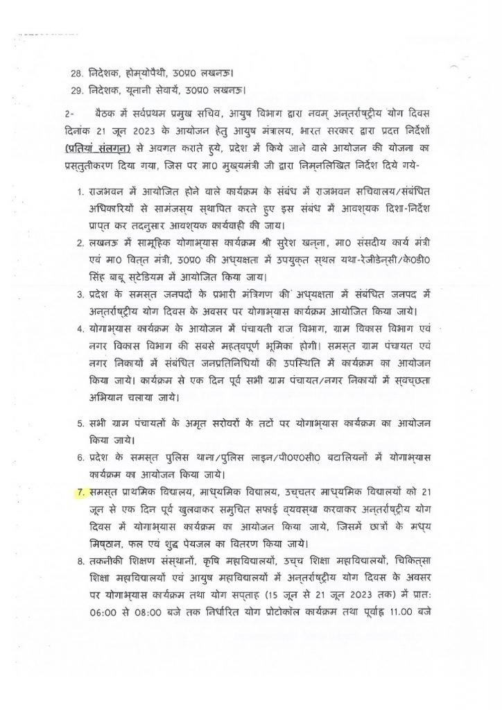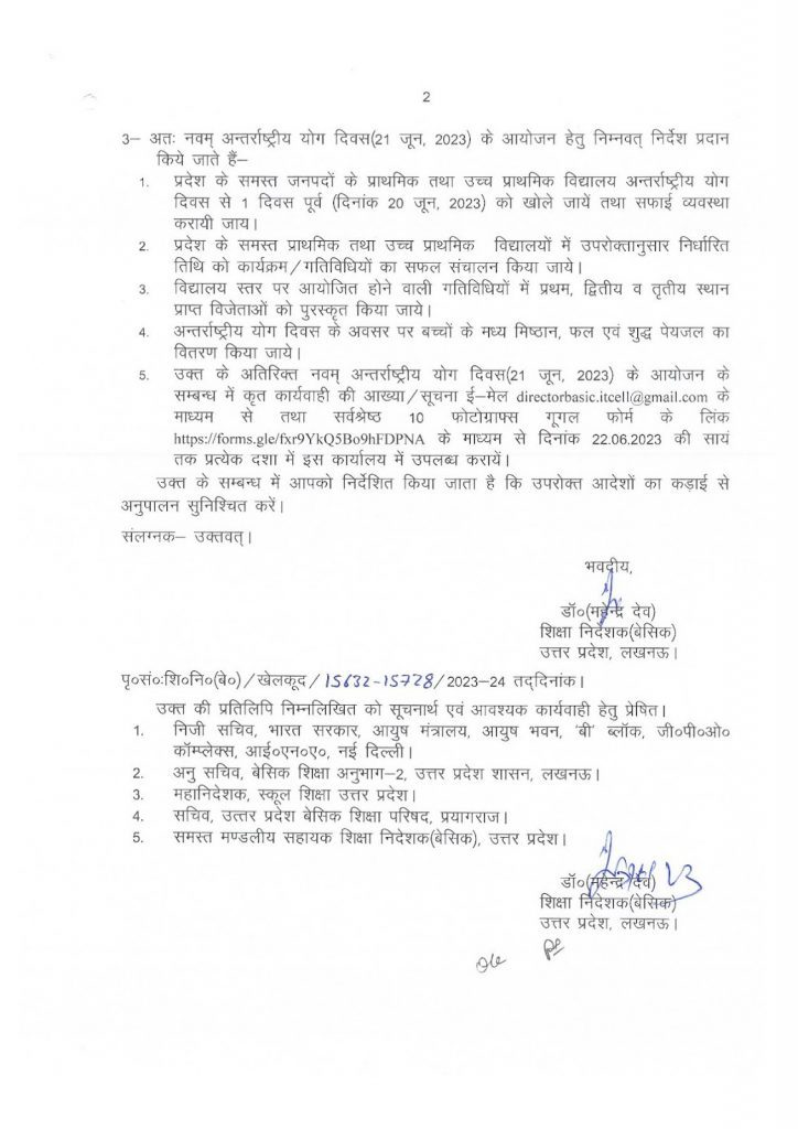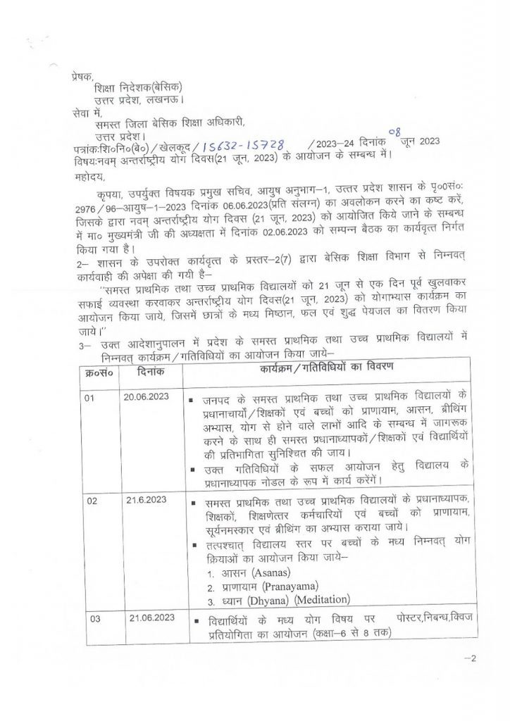 निर्देश में कहा गया है कि सभी प्राथमिक तथा उच्च प्राथमिक विद्यालयों के प्रधानाचार्य, शिक्षकों एवं बच्चों को प्राणायाम, आसन, ब्रीथिंग अभ्यास, योग से होने वाले लाभों के संबंध में जागरूक किया जाए। साथ ही सभी प्रधानाध्यापकों शिक्षकों व विद्यार्थियों की प्रतिभागिता सुनिश्चित की जाए। कक्षा छह से आठ के विद्यार्थियों के बीच योग विषय पर पोस्टर, निबंध, क्विज का भी आयोजन होगा। विद्यालय स्तर पर आयोजित होने वाली गतिविधियों में प्रथम, द्वितीय और तृतीय स्थान प्राप्त विजेताओं को पुरस्कृत किया जाएगा। सभी विद्यालयों में इस अवसर पर छात्रों को मिष्ठान वितरण के भी निर्देश दिए गए हैं।