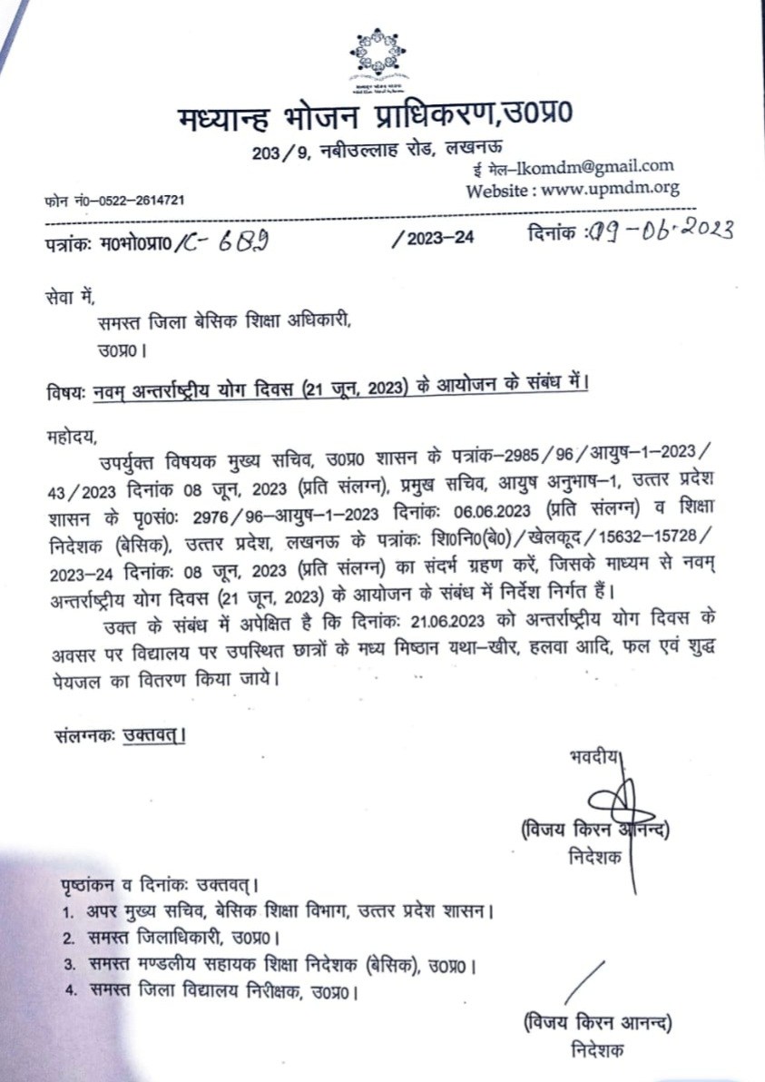 ग्रीष्मावकाश के बीच 21 जून को विश्व योग दिवस सभी विद्यालयों में मनाया जाएगा। इस दौरान विद्यालय में बच्चों के बीच योगाभ्यास कराया जाएगा तो उन्हें मिष्ठान, फल एवं शुद्ध पेयजल वितरण कराया जाएगा। जबकि योग दिवस के एक दिन पूर्व 20 जून को विद्यालय में साफ-सफाई कराई जाएगी।