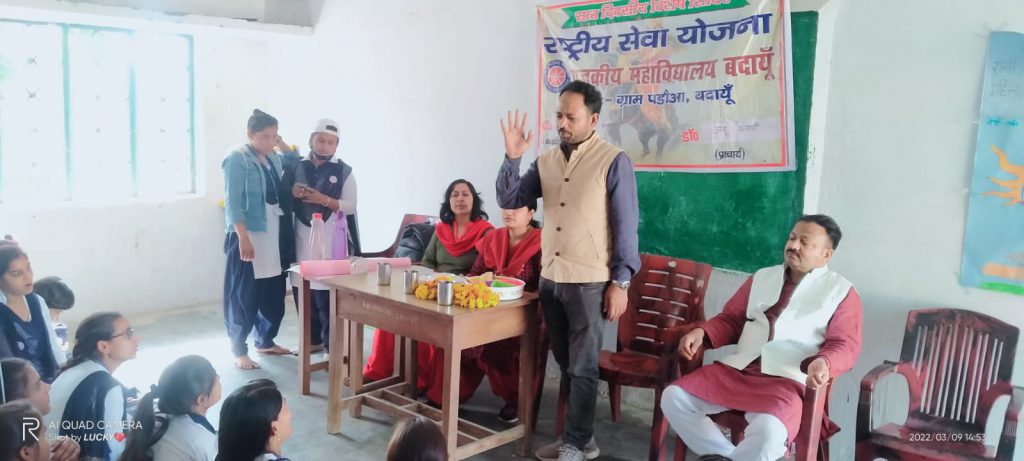 राजकीय महाविद्यालय आवास विकास बदायूं में संचालित राष्ट्रीय सेवा योजना की रानी लक्ष्मीबाई इकाई का पड़ौआ ग्राम में चल रहे सात दिवसीय विशेष शिविर के तीसरे दिन नारी शिक्षा व सुरक्षा दिवस का आयोजन किया गया। कार्यक्रम अधिकारी डॉ बबिता यादव के नेतृत्व में छात्राओं ने पड़ौआ ग्राम में डोर टू डोर सर्वेक्षण कर महिलाओं की शैक्षिक स्थिति का जायजा लिया। छात्राओं ने मेन्टल हेल्थकेयर की दृष्टि से महिलाओं से मिल कर घरेलू हिंसा से जुड़े मामलों में परामर्श प्रदान किया। डॉ बबिता यादव ने ग्राम वासियों को जागरूक करते हुए कहा कि नारी के सम्मान को किसी भी प्रकार से ठेस पहुँचाना चिन्ता का विषय है,जिससे पारिवारिक एवं सामाजिक सदभाव और समरसता को सर्वाधिक हानि पहुँचती है।