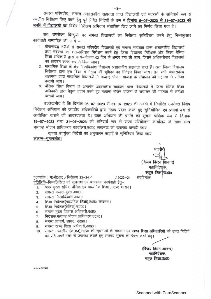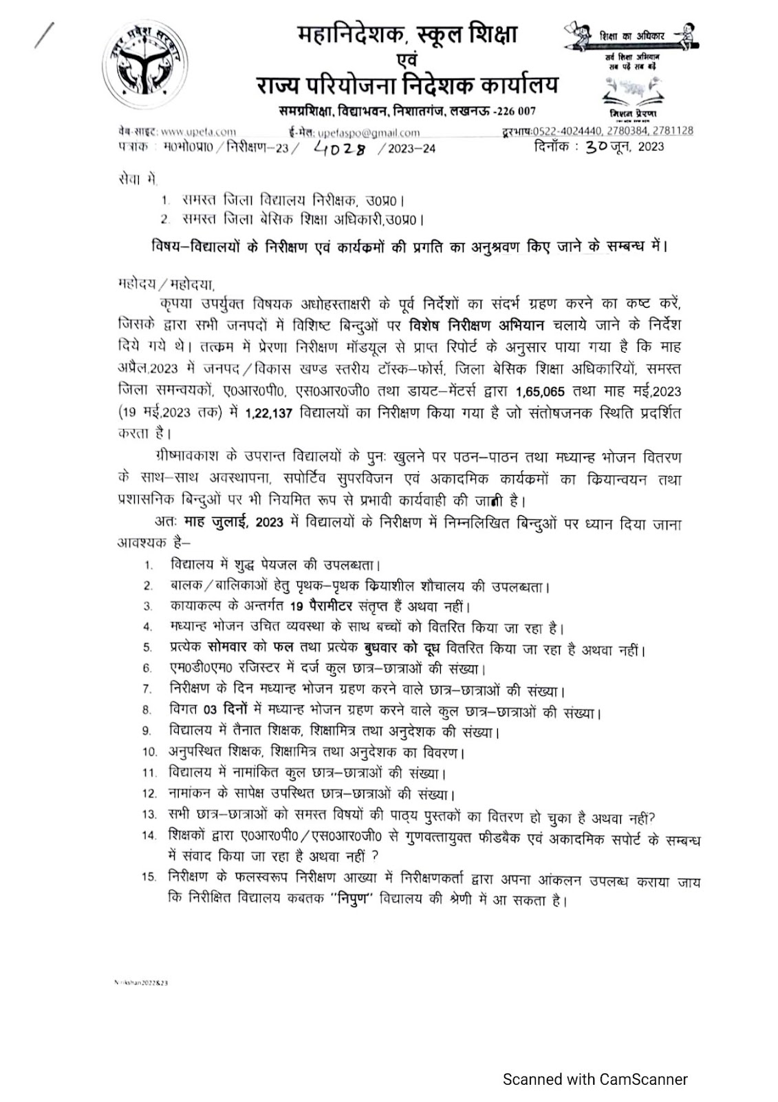 दिनांक 5-07-2023 से 31-07-2023 की अवधि में विद्यालयों का विशेष निरीक्षण अभियान संचालित किए जाने का आदेश जारी