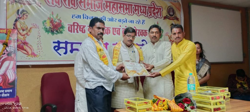 सामाजिक संगठन सर्व राव समाज महासभा भारत वर्ष में राव भाट भट्ट ब्रह्मभट्ट समाज के बड़े स्तरों के आयोजनों के लिऐ जाना जाता हैं विगत कई वर्षो से मप्र महासभा परिवार समाज कों जोड़ने व उत्कृष्ट कार्यों के लिऐ एक प्रेरणा दायक संगठन के रूप में निरंतर सामाजिक कार्य कर्ता आ रहा हैं। इस भव्य सम्मान समारोह में 38 जिलों के सामाजिक बंधुओ ने सहभागिता की प्रदेश अध्य़क्ष अशोक राव राठौर, संरक्षक विमल राव,वरिष्ठ प्रचारक कैलाश चंद्र, मात्र शक्ति प्रदेश अध्यक्षा श्रीमती विष्णु राव,उपाध्यक्ष मिथुन राव, कोषाध्यक्ष नरेश राव,सचिव अमित राव,सयुक्त सचिव राजकुमार राणा, रमेश कटारिया,नरेद्र राव,