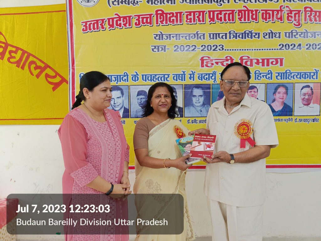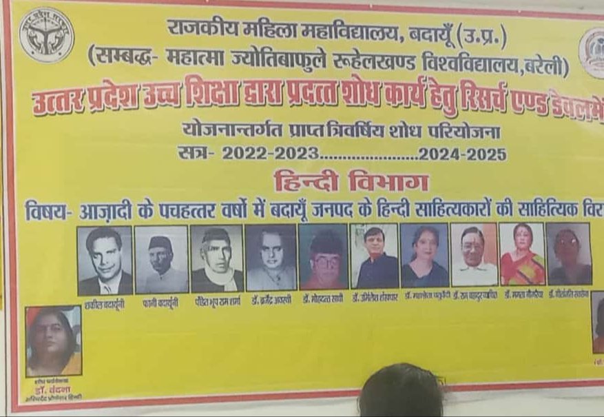 बदायूं/उत्तर प्रदेश : राजकीय महिला महाविद्यालय बदायूं के हिंदी विभाग में महाविद्यालय प्राचार्या डॉ स्मिता जैन के नेतृत्व में तथा हिंदी विभाग विभागाध्यक्ष डॉ वंदना के निर्देशन में शनिवार को शासन द्वारा प्रदत रिसर्च एंड डेवलपमेंट योजना के अंतर्गत प्राप्त त्रिवर्षीय शोध परियोजना आजादी के 75 वर्षों में बदायूं जनपद के हिंदी साहित्यकारों की साहित्यिक विरासत शीर्षक पर एक विचार गोष्ठी का आयोजन किया गया। शोध परियोजना में बदायूं जनपद के देश विदेश में विख्यात 10 साहित्यकारों की साहित्यिक विरासत पर प्रकाश डाला गया, कार्यक्रम में फानी बदायूनी, शकील बदायूनी, पंडित भूप राम शर्मा, डॉ बृजेंद्र अवस्थी, डॉ महोदत्त साथी, डॉ उर्मिलेश शंखधार , डॉ महाश्वेता चतुर्वेदी, डॉ राम बहादुर व्यथित, डॉ ममता नौगरैया, डॉ गीतांजलि सक्सेना जी के संपूर्ण साहित्यिक जीवन पर सभी ने अपने विचार रखे।