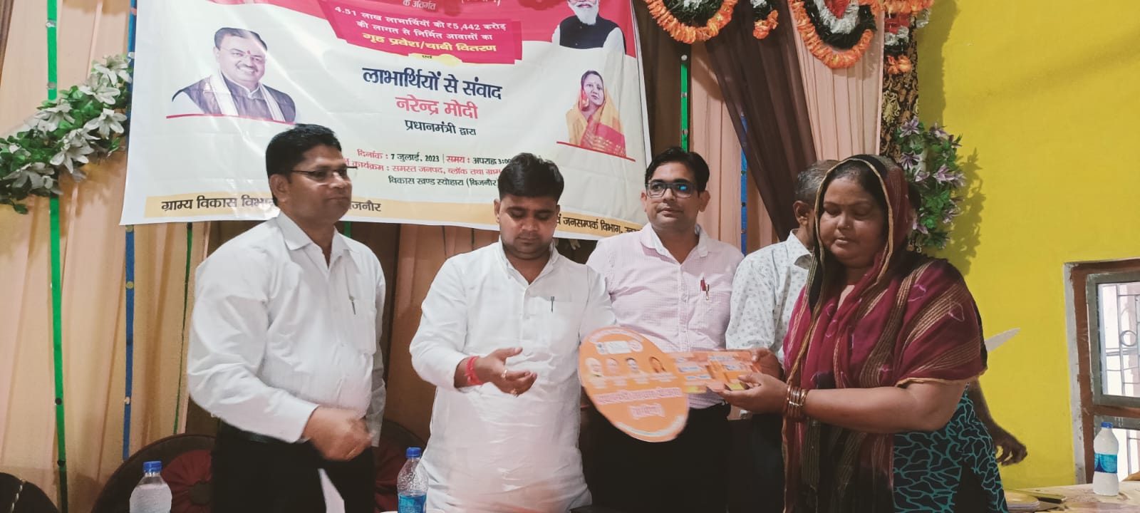 स्योहारा।मुरादाबाद रोड़ स्थित चिराग मंडप में प्रधानमंत्री आवास योजना के अंतर्गत मुख्य अतिथि ब्लाक प्रमुख उज्जवल चौहान की उपस्थिति में विकास खण्ड स्तर पर प्रधानमंत्री आवास योजना गृह प्रवेश/चाबी वितरण कार्यक्रम के अंर्तगत के वित्तीय वर्ष 2022-23 में विकास खण्ड बुढनपुर की 85 ग्राम पंचायतों में कुल 273 प्रधानमंत्री आवास योजना के लाभार्थियों के सापेक्ष कुल 11 लाभार्थियों को चाबी वितरित की गई तथा शेष 262 लाभार्थियों को ग्राम पंचायत स्तर पर संबंधित ग्राम पंचायत के ग्राम प्रधानों द्वारा चाबी वितरित की गई। मुरादाबाद रोड़ स्थित चिराग मंडप में प्रधानमंत्री आवास योजना प्रधानमंत्री श्री नरेन्द्र मोदी जी द्वारा देश में कुल 4.51 लाख प्रधानमंत्री आवास योजना (ग्रा0) के लाभार्थियों के निर्मित आवासों का गृह प्रवेश/चाबी वितरण एवं लाभार्थियों से संवाद का सीधा प्रसारण सायं 530 बजे बड़ी स्क्रीन पर दिखाया गया। कार्यक्रम के अवसर पर खंड विकास अधिकारी रामकुमार सीएचसी प्रभारी विशाल दिवाकर ,प्रमोद कुमार, दिनेश सिंह एडीओ , प्रदीप कुमार लेखाकार , अवनीश कुमार एडीओ, समस्त ग्राम पंचायत सचिव उपस्थित रहे।