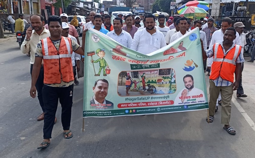 स्योहारा – नगर पालिका परिषद स्योहारा में नगर सफाई महा अभियान पालिका अध्यक्ष श्री फैसल वारसी जी और अधिशासी अधिकारी विजेंद्र सिंह पाल जी के अनुपालन में नगर में सफाई अभियान चलाया गया और नागरिकों से अपील की गई कि अपने घरों का कूड़ा इधर उधर ना फेंके कूड़ा कूड़ेदान में रखें नगर पालिका परिषद की गाड़ी आपके द्वार पर आती है कूड़ा गाड़ी में ही डालें अपने नगर को स्वच्छ साफ स्वच्छ बनाने में अपना सहयोग दें और नागरिकों से अपील की गई फीडबैक कराएं अपने शहर को नंबर 1 बनाएं. सफाई अभियान मै नगर पालिका कर्मचारी और वार्ड सभासद भी शामिल रहे .