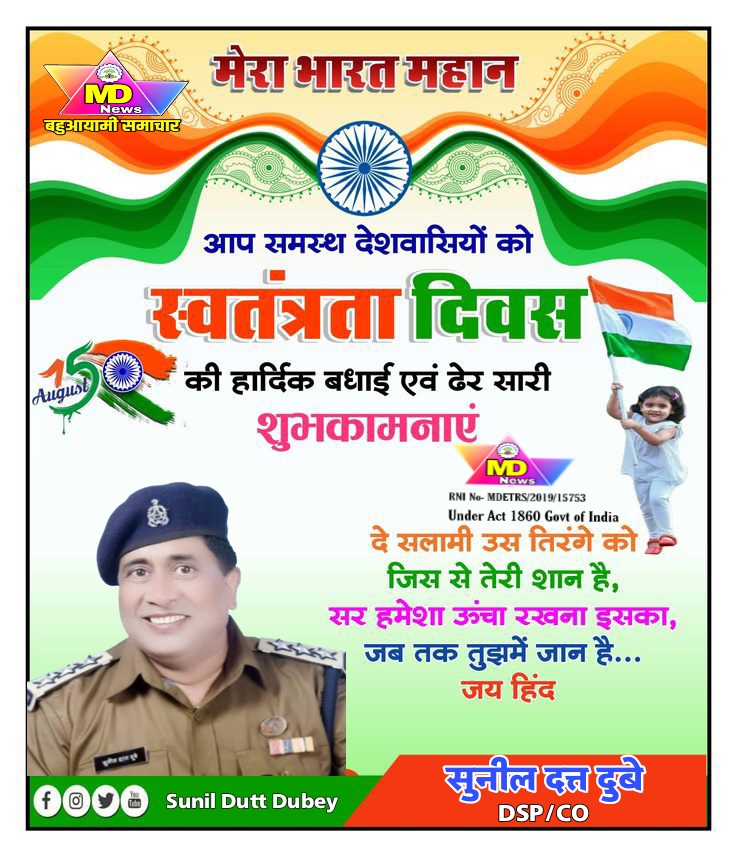 आप सभी ग्रामवासियों, क्षेत्रवासियों, नगरवासियों एवं समस्त देशवासियो को सुनील दत्त दुबे(C.O)की तरफ से 77 वें स्वतंत्रता दिवस की हार्दिक शुभकामनाएं..