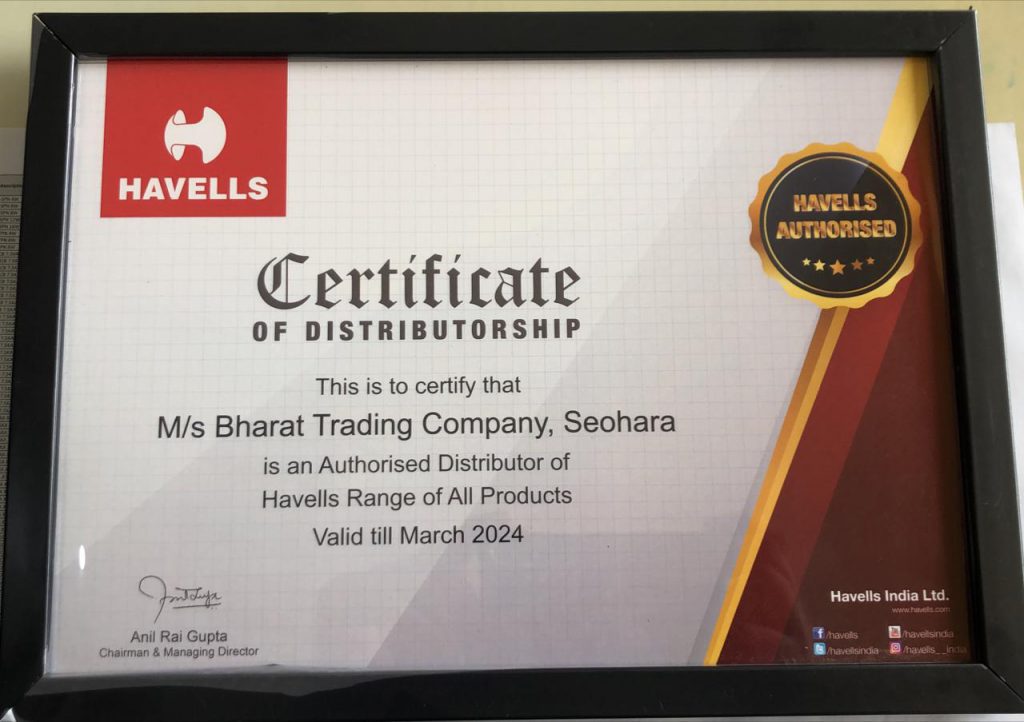 स्योहारा। ठाकुरद्वारा रोड स्थित एम एस भारत ट्रेडिंग कंपनी के स्वामी शावेज़ शैख को हैवल्स इलेक्ट्रिक कंपनी ने ऑथराइज्ड डिस्ट्रीब्यूटर बनाया। ओर साथ ही कंपनी का सर्टिफिकेट देकर उनके कार्य की सराहना की। शोरुम स्वामी शावेज़ शैख ने बताया कि हमारे यहां हैवल्स कंपनी का सभी सामान उचित रेट पर दिया जाता है जिसमे हैवल्स की सभी प्रकार की वायर,फैन,स्विच बोर्ड, मॉडलर,लाइट आदि सभी सामान बहुत ही मुनासिब रेट पर मिलता है।