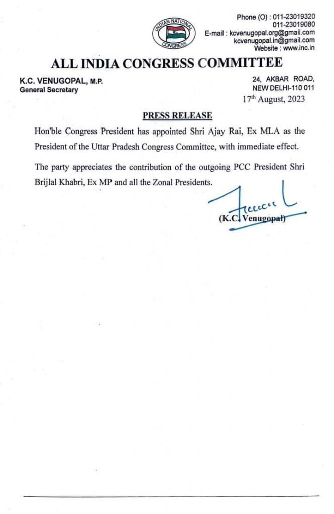 वाराणसी। 2024 लोकसभा चुनाव से पहले उत्तर प्रदेश कांग्रेस ने पीएम मोदी के खिलाफ वर्णासी लोकसभा सीट पर चुनाव लडने वाले कांग्रेस के कद्दावर नेता अजय राय को प्रदेश अध्यक्ष बनाए जाने की घोषणा की है। अजय राय को प्रदेश अध्यक्ष बनाए जाने की खबर से वाराणसी कांग्रेस पदाधिकारियों में हर्ष का माहौल है। प्रदेश अध्यक्ष बनाए जाने के बाद कांग्रेस के पदाधिकारी लगातार अजय राय को बधाई देने में जुट गए है।वही इससे पहले कांग्रेस के प्रदेश अध्यक्ष बृजलाल खाबरी थे। अजय राय को प्रदेश अध्यक्ष बनाए जाने पर वाराणसी महानगर और जिला अध्यक्ष ने हर्ष व्यक्त करते कहा कि अजय राय कांग्रेस की एक हु जुझारू नेता है और कांग्रेस ने प्रदेश अध्य बना कर पार्टी को मजबूत करने की जिम्मेदारी उनको दी है।