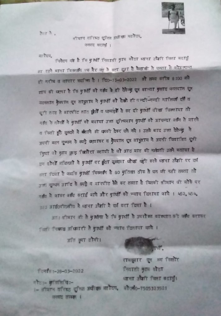 उघैती (बदायूं) ग्राम कोठा निवासी राजकुमार पुत्र रूपकिशोर ने एसएससी को पत्र भेजकर न्याय की गुहार लगाई है विकलांग राजकुमार ने बताया कि वह एक पैर से पूरी तरह विकलांग है और बैसाखी से चलता है तथा काफी गरीब और लाचार है 13 मार्च को समय 8:00 बजे प्रार्थी राजकुमार को गांव के ही देवेंद्र पुत्र कांता जगतपाल पुत्र मदनलाल प्रेमपाल पुत्र साधु राम ने देखकर गंदी गंदी गालियां दी और उसके साथ मारपीट की गांव के लोगों ने मौके पर आकर उसे बचाया