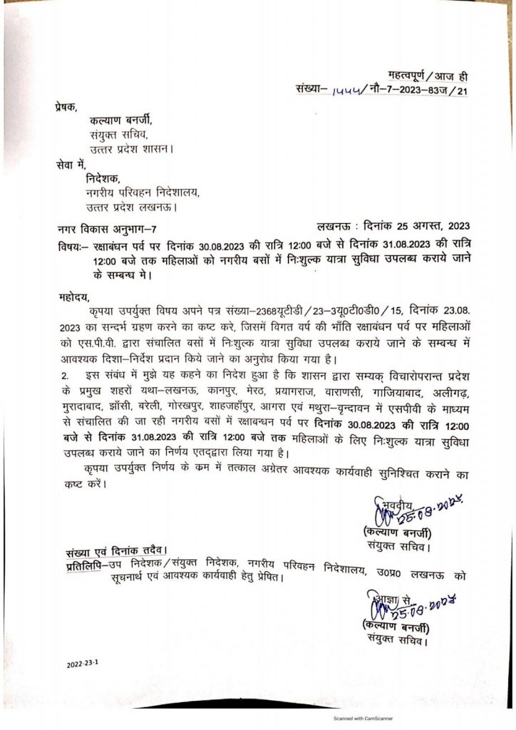 अफसरों का कहना है कि एक दो दिन में आदेश आ जाएगा। इस बीच नगरीय परिवहन निदेशालय ने प्रयागराज, लखनऊ, कानपुर, मेरठ, वाराणसी, गाजियाबाद, अलीगढ़, मुरादाबाद, झांसी, बरेली, गोरखपुर शाहजहांपुर, आगरा, मथुरा में चल रही सिटी बसों में फ्री सफर का एलान कर दिया है।