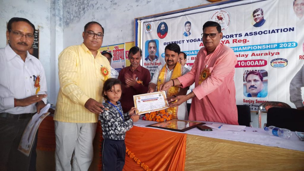 औरैया के भारतीय विद्यालय में 27 अगस्त को डिस्ट्रिक्ट योगासन स्पोर्ट एसोसिएशन औरैया के तत्वावधान में आयोजित योगासन खेल प्रतियोगिता में जनपद के बच्चों का बड़ चड कर बोल बाला रहा जिसमें अलग अलग कैटेगरी में बच्चों में योगासन गेल का हुनर दिखा। वही सब जूनियर कैटेगरी में आर्टिस्टिक सिंगल में प्रदर्शन करते हुए जूली को प्रथम स्थान व मानवी को द्वितीय स्थान प्राप्त हुआ जो कि दोनो खिलाड़ी अब बहुत जल्द नोयडा में होने वाली स्टेट चैम्पियनशिप में प्रतिभाग करेगी। और जनपद का नाम रोशन करेगी। ये दोनो बेटियाँ ग्राम तेज का पुर्वा की निवासी है। जो कि इसी ग्राम के निवासी स्टेट रैफरी अंकित योगी की देख रेख में अपनी तैयारी कर रही है। इस कार्यक्रम के दौरान मुख्य अतिथि पूर्व कृषि राज्य मंत्री लाखन सिंह राजपूत डिस्ट्रिक्ट योगासन स्पोर्ट एसोसिएशन के अध्यक्ष आदरणीय कृष्ण मोहन उपाध्याय एवं महासचिव मनीष मिश्रा एवं संस्था के सभी सम्मानित पदाधिकारी उपस्थित रहे ।