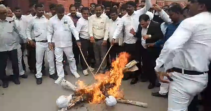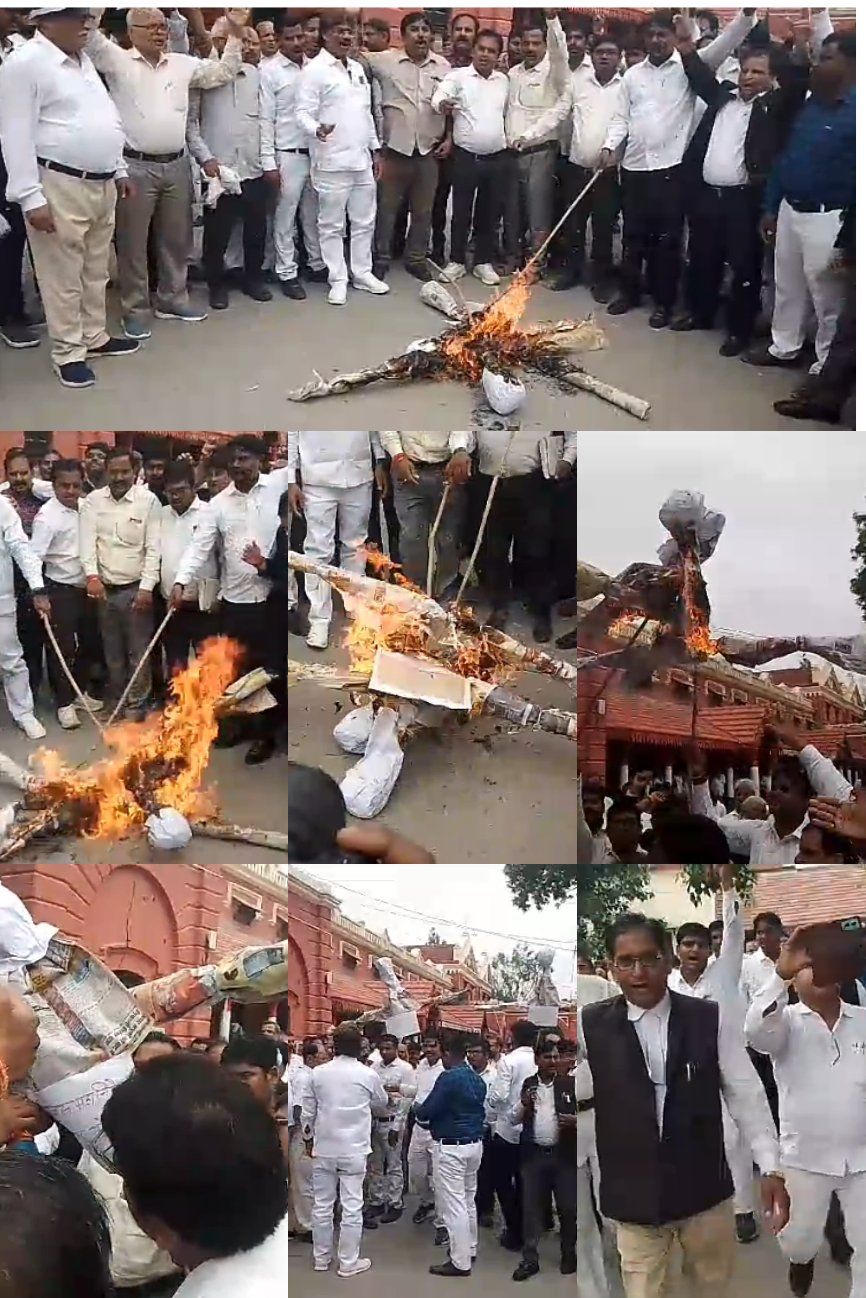 हापुड़ जिले में 29 अगस्त को पुलिस प्रसाशन द्वारा निर्दोष एवं निहत्थे अधिवक्ताओं पर किये बर्बरतापूर्ण लाठीचार्ज के विरोध में बार काउंसिल ऑफ यूपी के आह्वाहन पर आज कलेक्ट्रेट के अधिवक्ताओं का हुजूम कलेक्ट्रेट परिसर में चक्रमण कर नारेबाजी करते हुए पुलिस प्रशाशन मुर्दाबाद के नारे लगाए और जिलाधिकारी कार्यालय पर प्रदेश के मुख्य सचिव और पुलिस महानिदेशक का पुतला दहन किया।