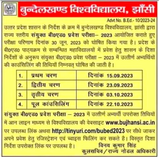 UPBED(झाँसी) : बीएड संयुक्त प्रवेश परीक्षा (जेईई-2023) के संयोजक बुंदेलखंड विश्वविद्यालय ने तीन चरण में काउंसिलिंग का कार्यक्रम जारी कर दिया। काउंसिलिंग का पहला चरण 15 सितंबर, दूसरा चरण 23 सितंबर और तीसरा चरण तीन अक्टूबर से प्रारंभ होगा। इसके बाद पूल काउंसिलिंग होगी।बुंदेलखंड विश्वविद्यालय ने बीएड संयुक्त प्रवेश परीक्षा का परिणाम 30 जून 2023 को घोषित करने के बाद बीएड की काउंसिलिंग दस जुलाई से प्रस्तावित की थी। लखनऊ, मेरठ व आगरा विश्वविद्यालय के परीक्षा परिणाम समय पर घोषित न करने से काउंसिलिंग लगभग दो माह देरी से शुरू हो रही है। बुंदेलखंड विश्वविद्यालय के कुलसचिव विनय कुमार सिंह ने बताया कि बीएड संयुक्त प्रवेश परीक्षा की काउंसिलिंग 15 सितम्बर से होगी।