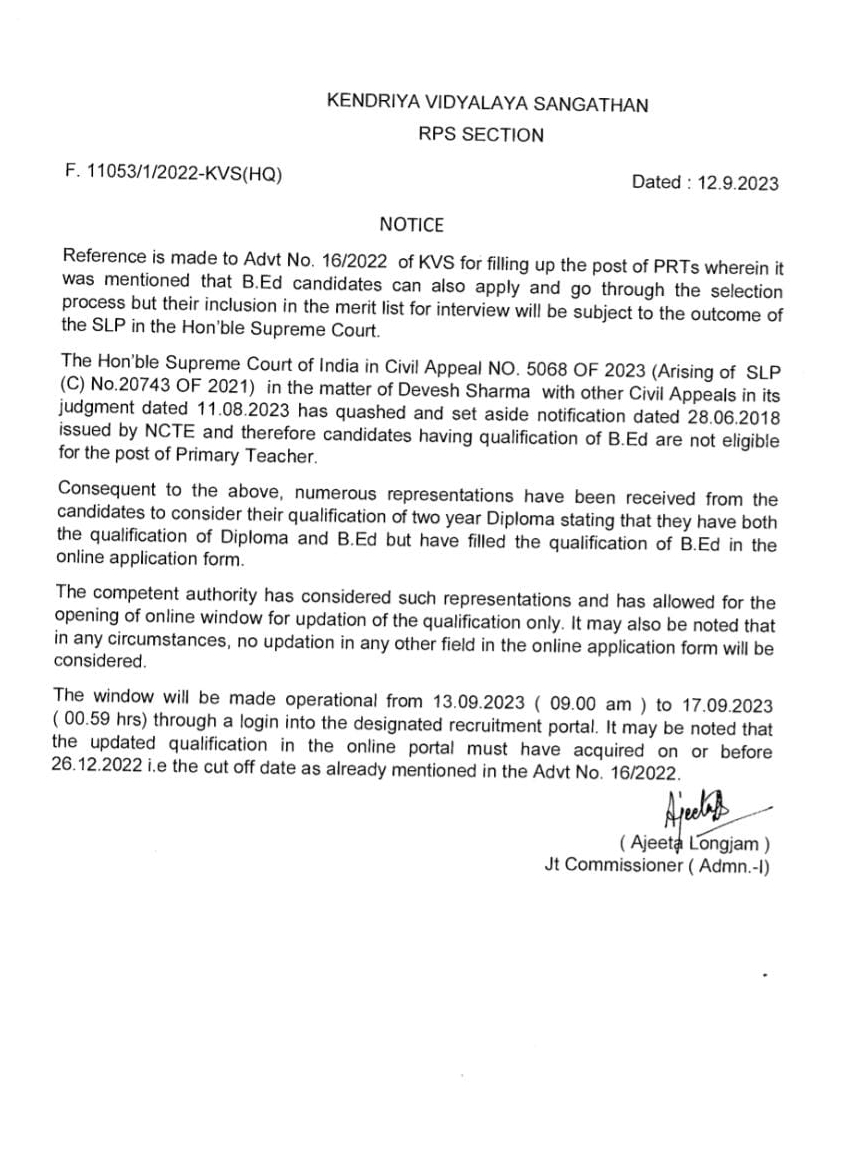 केन्द्रीय विद्यालयों में पीआरटीएस के पद को भरने के लिए केवीएस ने विज्ञापन निकाला था जिसमें यह उल्लेख था कि बीएड डिग्री वाले उम्मीदवार भी आवेदन कर चयन प्रक्रिया से गुजर सकते हैं, लेकिन साक्षात्कार के लिए मेरिट सूची में उनका शामिल होना उच्चतम न्यायालय के फैसले के अधीन होगा। सर्वोच्च न्यायालय ने सिविल अपील सं. 5068 ओएफ 2023 देवेश शर्मा के मामले में अन्य सिविल अपीलों के साथ 11 अगस्त को अपने फैसले में एनसीटीई द्वारा जारी 28 जून 2018 की अधिसूचना को रद्द कर दिया है। इसलिए उम्मीदवारों की बीएड की योग्यता प्राथमिक शिक्षक के पद के लिए पात्र नहीं है।