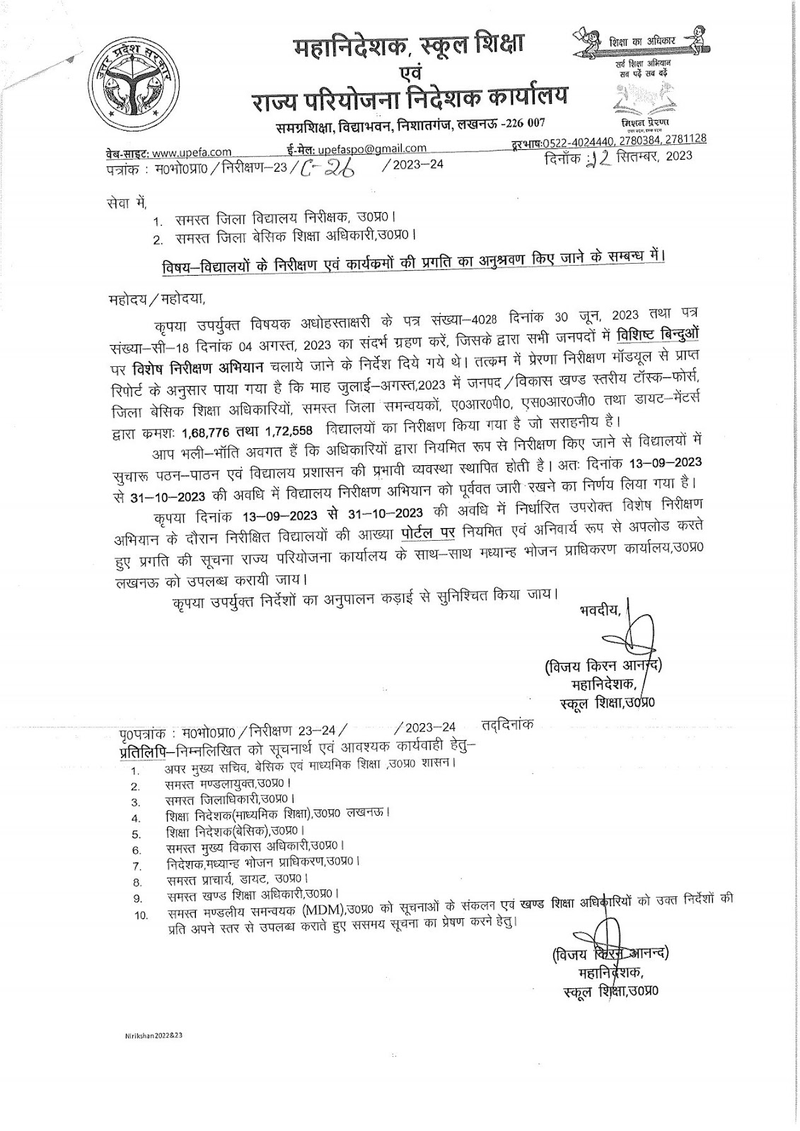 लखनऊ:प्रदेश के परिषदीय स्कूलों में 31 अक्तूबर तक सघन निरीक्षण अभियान चलाया जाएगा। महानिदेशक स्कूल शिक्षा विजय किरन आनंद ने सभी बीएसए को भेजे पत्र में लिखा है कि जुलाई-अगस्त में जिला व विकास खंड स्तरीय टास्क फोर्स, बीएसए, जिला समन्वयकों, एआरपी-एसआरजी तथा डायट मेंटर्स ने क्रमश 1,68,776 तथा 1,72,668 विद्यालयों का निरीक्षण किया गया।नियमित निरीक्षण से विद्यालयों में पठन-पाठन की प्रभावी व्यवस्था स्थापित होती है। लिहाजा 31 अक्तूबर तक विद्यालय निरीक्षण अभियान को पूर्ववत जारी रखें।