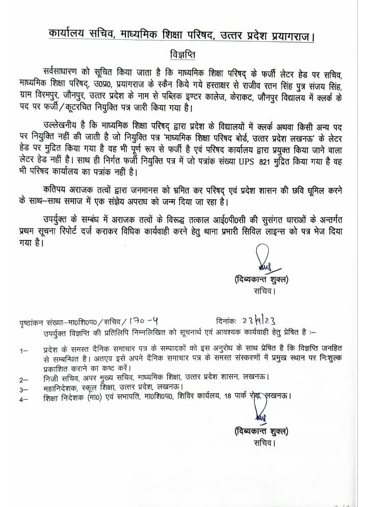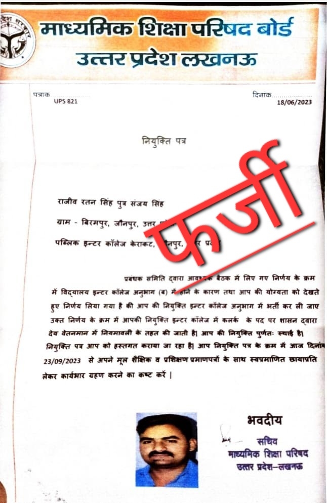 बता दें, माध्यमिक शिक्षा परिषद के फर्जी लेटर हेड पर सचिव माध्यमिक शिक्षा परिषद उत्तर प्रदेश प्रयागराज के स्कैन किए गए हस्ताक्षर से राजीव रतन सिंह पुत्र संजय सिंह ग्राम विरमपुर, जौनपुर उत्तर प्रदेश के नाम से पब्लिक इंटर कॉलेज केराकट जौनपुर विद्यालय में क्लर्क के पद पर फर्जी नियुक्ति पत्र जारी किया गया है।सचिव दिव्यकांत शुक्ला ने बताया कि माध्यमिक शिक्षा परिषद द्वारा प्रदेश के विद्यालयों में क्लर्क अथवा किसी अन्य पद पर नियुक्ति नहीं की जाती है।जो नियुक्ति पत्र माध्यमिक शिक्षा परिषद उत्तर प्रदेश लखनऊ के लेटर हेड पर मुद्रित किया गया है।वह पूर्ण रूप से फर्जी व परिषद कार्यालय द्वारा प्रयुक्त किए जाने वाला लेटर हेड नहीं है।साथ ही निर्गत फर्जी नियुक्ति पत्र में जो प्राप्तांक संख्या यूपीएस 821 मुद्रित है वह भी परिषद कार्यालय का प्राप्तांक नहीं है।
