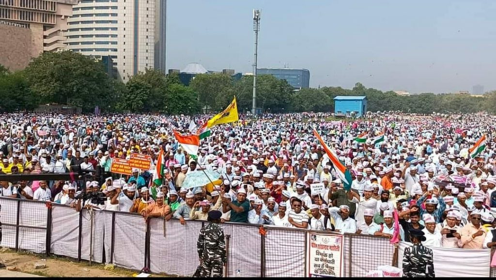 नई दिल्ली।पुरानी पेंशन बहाली के लिए देशभर से आए लाखों कर्मियों ने 01 अक्टूबर दिन रविवार को दिल्ली के रामलीला मैदान में हुंकार भरी है। केंद्र और राज्य सरकारों के कर्मचारी संगठनों के नेताओं ने ‘पेंशन शंखनाद महारैली’ में कहा, अगर सरकार अपनी जिद नहीं छोड़ती है तो ‘वोट की चोट’ के आधार पर ‘पुरानी पेंशन’ बहाल कराएंगे। सरकारी कर्मियों, पेंशनरों और उनके रिश्तेदारों को मिलाकर यह संख्या दस करोड़ के पार चली जाती है। एनपीएस में कर्मियों जो पेंशन मिल रही है, उतनी तो बुढ़ापा पेंशन ही है। एनपीएस स्कीम में शामिल कर्मी, 18 साल बाद रिटायर हो रहे हैं, उन्हें क्या मिला है। एक कर्मी को एनपीएस में 2417 रुपये मासिक पेंशन मिली है, दूसरे को 2506 रुपये और तीसरे कर्मी को 49 सौ रुपये प्रतिमाह की पेंशन मिली है।