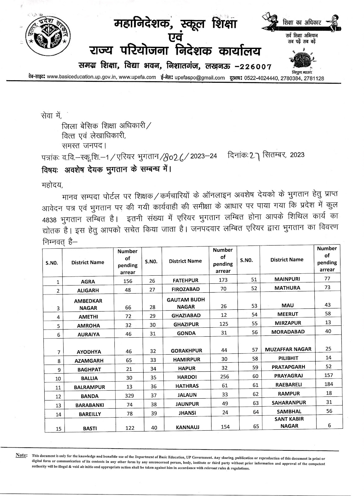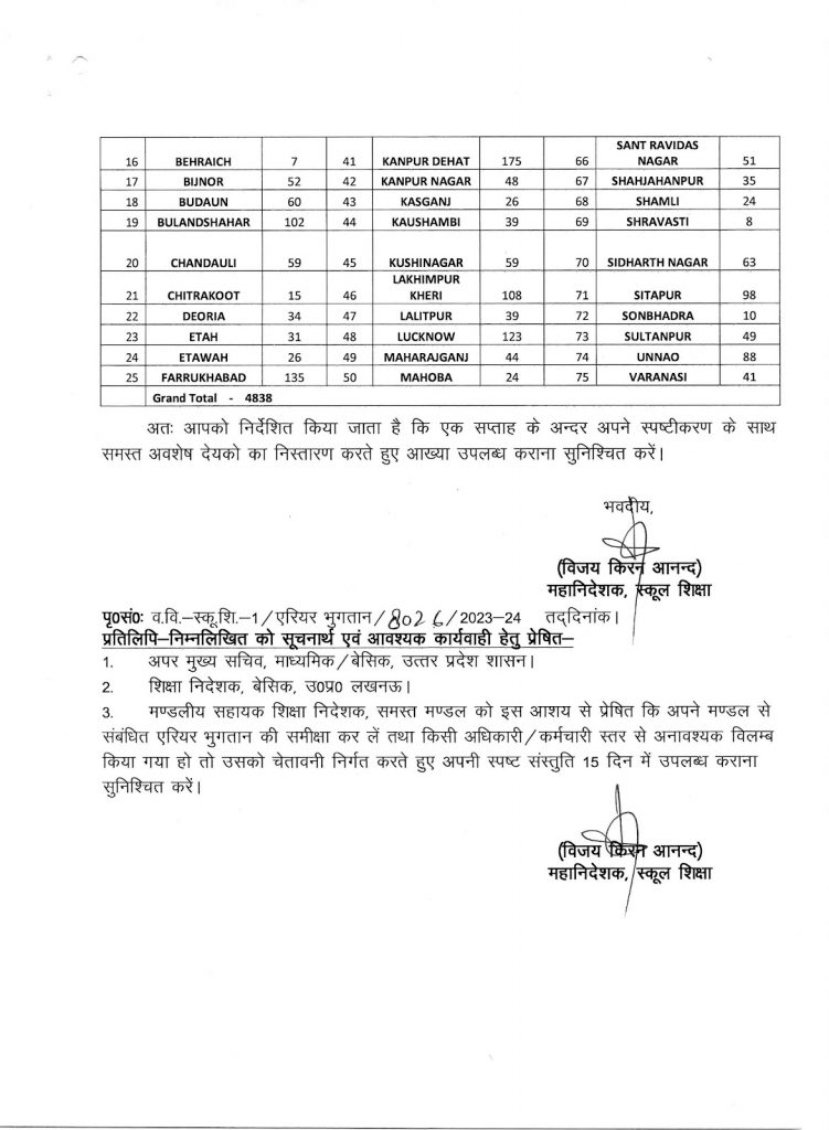 मामले में महानिदेशक ने सभी बेसिक शिक्षा अधिकारियों से स्पष्टीकरण तलब किया है। पूरे प्रदेश में सर्वाधिक 329 मामले बांदा में लंबित हैं। हरदोई में 256, रायबरेली 184, कानपुर देहात 175, फतेहपुर 173, प्रयागराज 157, आगरा 156, कन्नौज 154, फर्रुखाबाद 135, गाजीपुर 125, लखनऊ 123, बस्ती 122, लखीमपुर खीरी 108 व बुलंदशहर में 102 मामले लंबित हैं। ऑनलाइन व्यवस्था में शिक्षक मानव संपदा पोर्टल पर आवेदन करता है। जिसे संबंधित खंड शिक्षा अधिकारी को अग्रसारित करना होता है। फिर वित्त एवं लेखाधिकारी कार्यालय से बिल बनाकर भुगतान होता है।