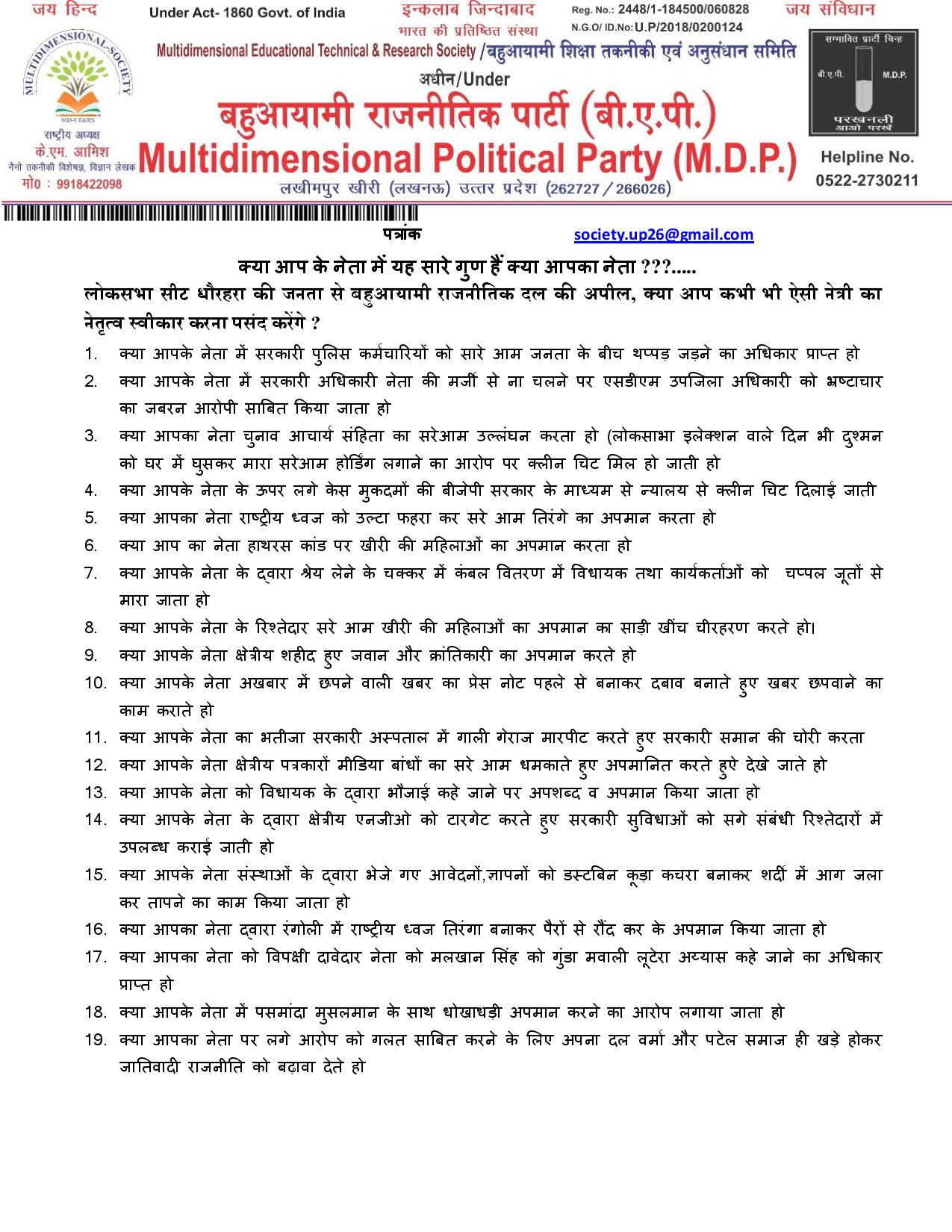 लोकसभा सीट धौरहरा की जनता से बहुआयामी राजनीतिक दल की अपील