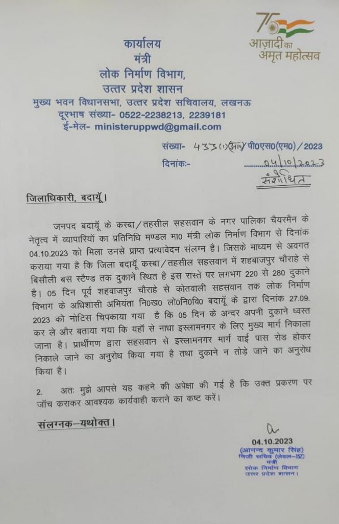 जनपद बदायूँ के कस्बा / तहसील सहसवान के नगर पालिका चैयरमैन के नेतृत्व में व्यापारियों का प्रतिनिधि मण्डल मा0 मंत्री लोक निर्माण विभाग से दिनांक 04.10.2023 को मिला उनसे प्राप्त प्रत्यावेदन संलग्न है। जिसके माध्यम से अवगत कराया गया है कि जिला बदायूँ कस्बा / तहसील सहसवान में शहबाजपुर चौराहे से बिसौली बस स्टैण्ड तक दुकाने स्थित है इस रास्ते पर लगभग 220 से 280 दुकाने है। 05 दिन पूर्व शहवाजपुर चौराहे से कोतवाली सहसवान तक लोक निर्माण विभाग के अधिशासी अभियंता नि०ख० लो०नि०वि० बदायूँ के द्वारा दिनांक 27.09. 2023 को नोटिस चिपकाया गया है कि 05 दिन के अन्दर अपनी दुकाने ध्वस्त कर ले और बताया गया कि यहाँ से नाधा इस्लामनगर के लिए मुख्य मार्ग निकाला जाना है। प्रार्थीगण द्वारा सहसवान से इस्लामनगर मार्ग वाई पास रोड होकर निकाले जाने का अनुरोध किया गया है तथा दुकाने न तोड़े जाने का अनुरोध किया है।