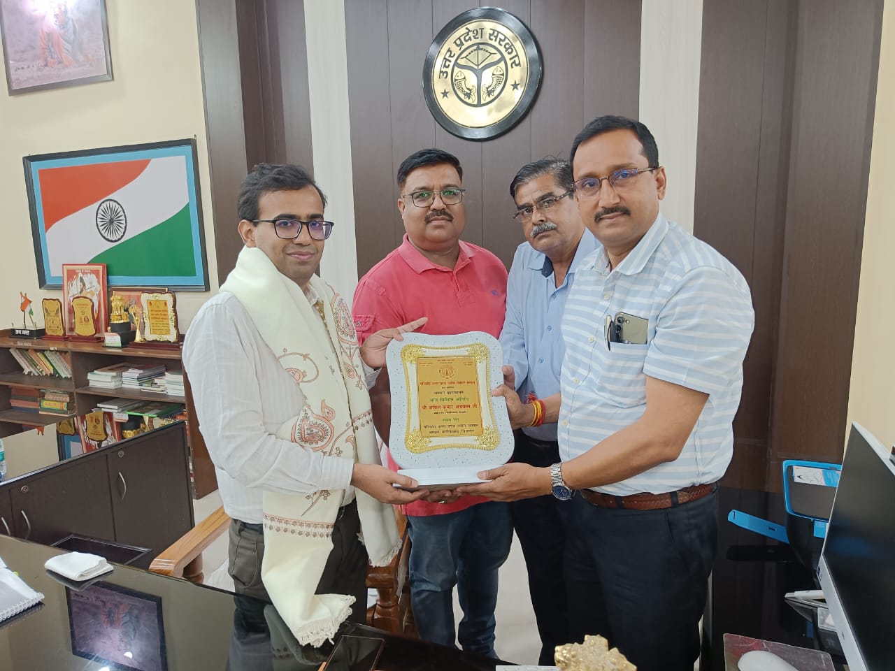 बिजनौर।पश्चिमी उत्तर प्रदेश उद्योग व्यापार मंडल बिजनौर के एक प्रतिनिधिमंडल ने प्रदेश महामंत्री मुकुल अग्रवाल के नेतृत्व में बिजनौर के लोकप्रिय जिलाधिकारी अंकित कुमार अग्रवाल IAS से उनके आवास पर भेट की ओर संघठन द्वारा आयोजित व्यापारी महापंचायत का स्मृति चिन्ह और अंग वस्त्र भेट किया इस अवसर पर विनीत राजपूत प्रदेश सह कोषाध्यक्ष,प्रशांत गुप्ता मोनू जिला महामंत्री,अक्षय अग्रवाल युवा नगर अध्यक्ष बिजनौर उपस्थित रहे।