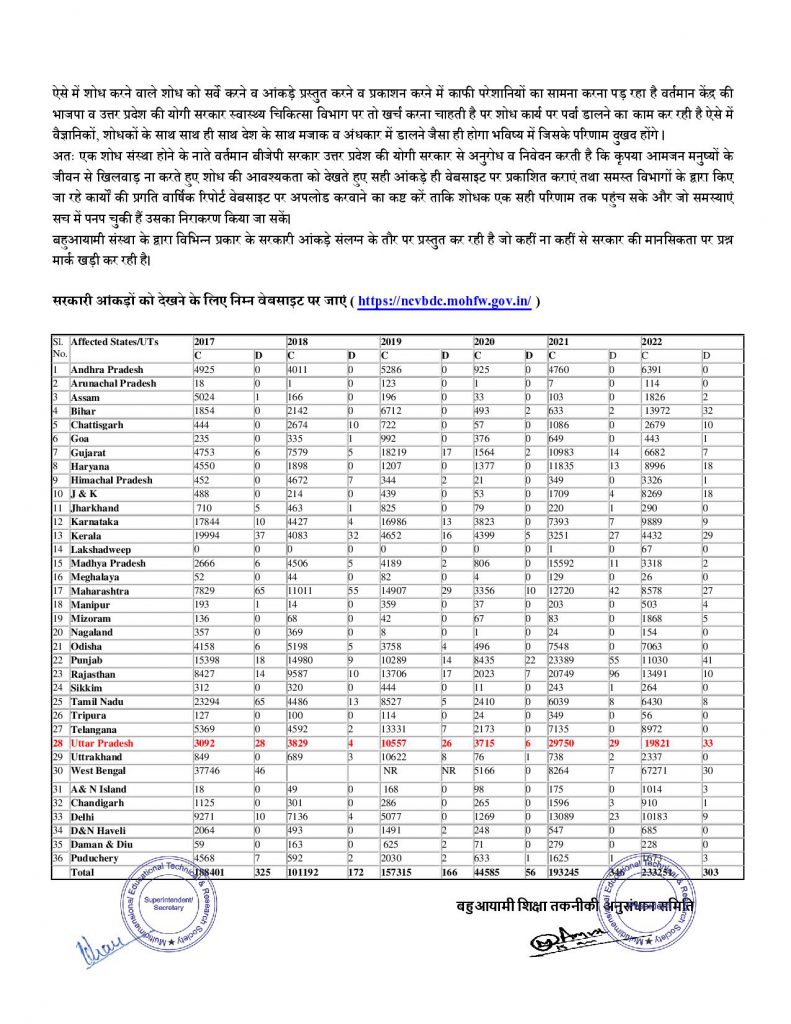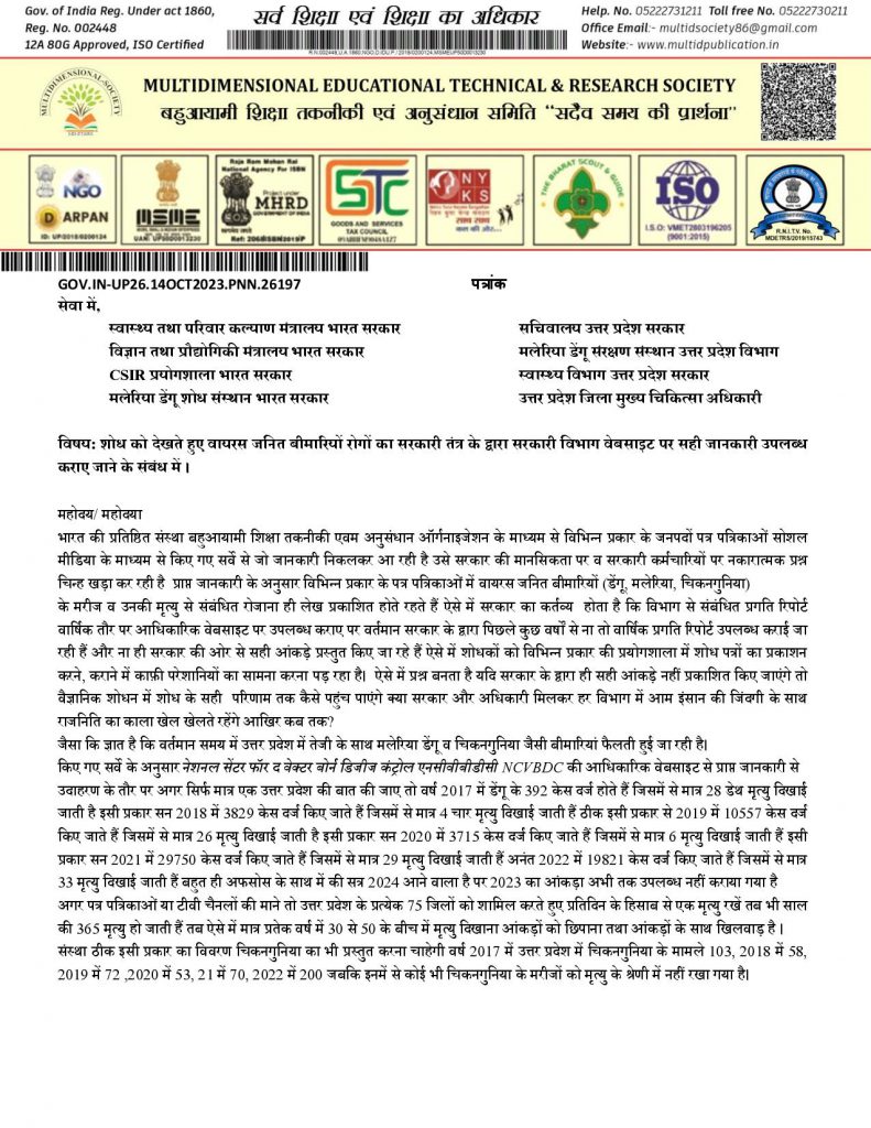 विषय: शोध को देखते हुए वायरस जनित बीमारियों रोगों का सरकारी तंत्र के द्वारा सरकारी विभाग वेबसाइट पर सही जानकारी उपलब्ध कराए जाने के संबंध में ।