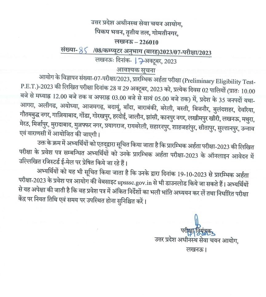 लखनऊ। प्रदेश में समूह ग की भर्तियों के लिए प्रारंभिक अर्हता परीक्षा (पीईटी) 2023 का आयोजन 28-29 अक्तूबर को होगा। उप्र अधीनस्थ सेवा चयन आयोग ने मंगलवार को अभ्यर्थियों को उनके रजिस्टर्ड ईमेल पर प्रवेश पत्र भेज दिया।